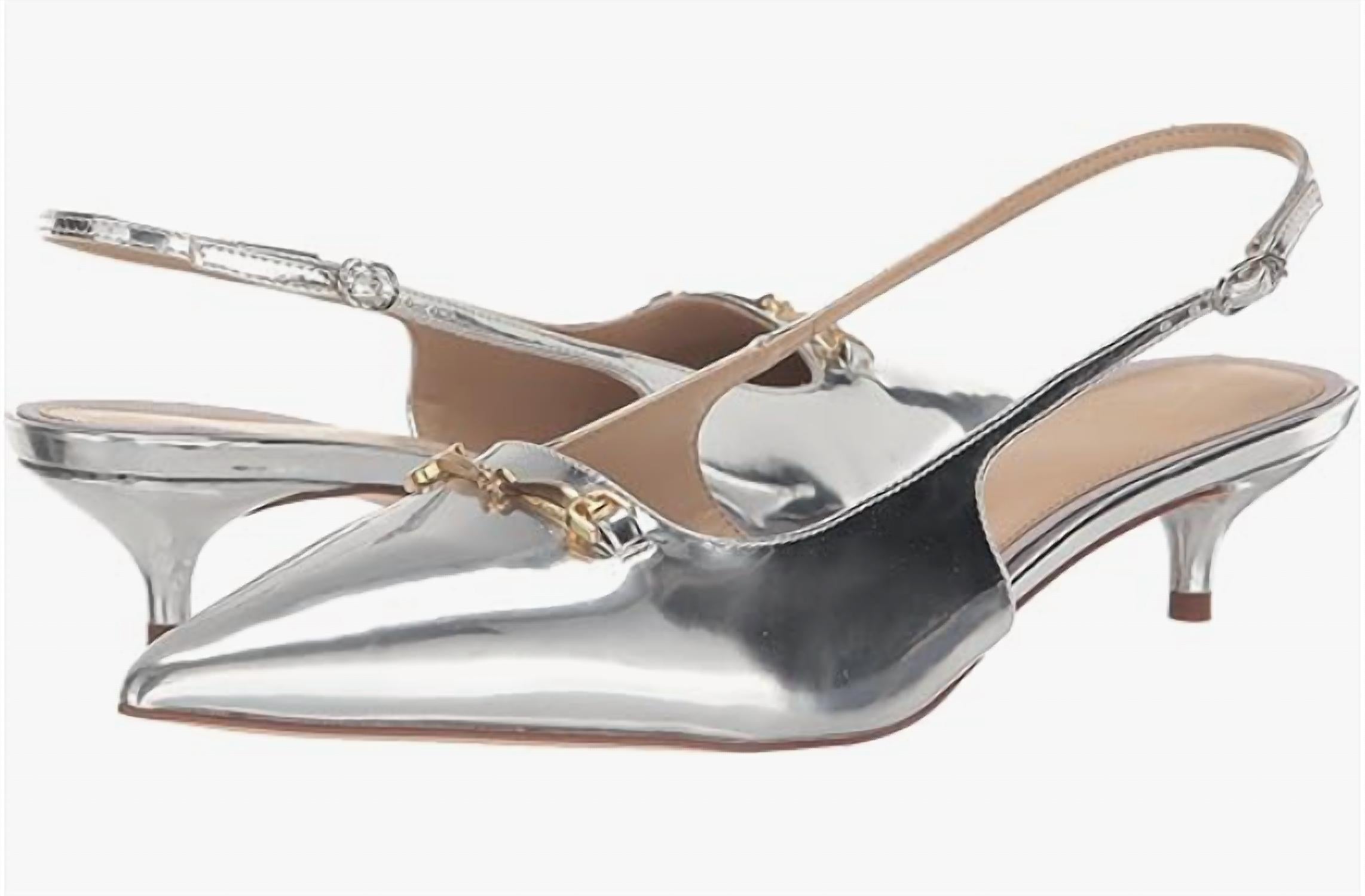 The perfect height for day to night. Step into sophisticated style with the Women's Fitzgerald Slingback Pump by Sam Edelman in Soft Silver. This elegant heel features a chic pointed toe and a comfortable kitten heel height of 1.4 inches. Crafted from synthetic materials, it boasts a stylish horsebit detail, reminiscent of classic Oxford designs, and is secured with a buckle closure. Perfect for Spring events or a New Year's Eve wedding, this versatile pump effortlessly complements any workwear ensemble.