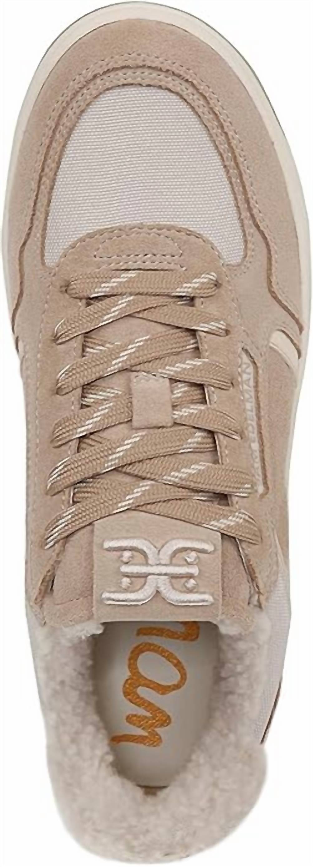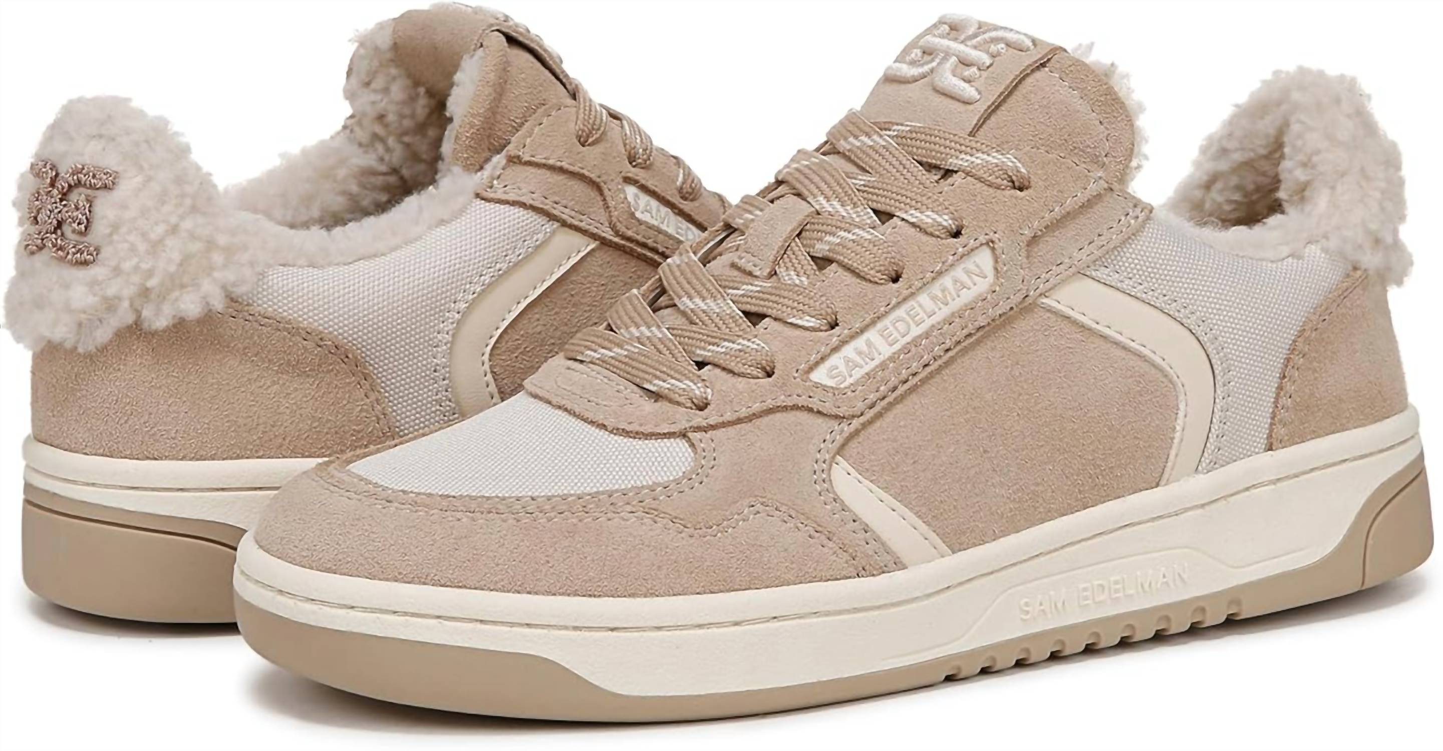 Get your daily steps in with these adorable sneakers. Meet the Women's Harper Cozy Sneaker by Sam Edelman, a chic skater-inspired shoe in Oat/Nature Mist Suede perfect for fall travel or Thanksgiving gatherings. Crafted from a blend of leather, fabric, and synthetic materials, this low-top sneaker features an almond toe and a comfortable 1.1-inch heel height. The insole is synthetic with a lace-up closure and a cozy shearling trim for a warm, inviting feel. A versatile addition to any weekend outfit, these sneakers effortlessly blend style and comfort.