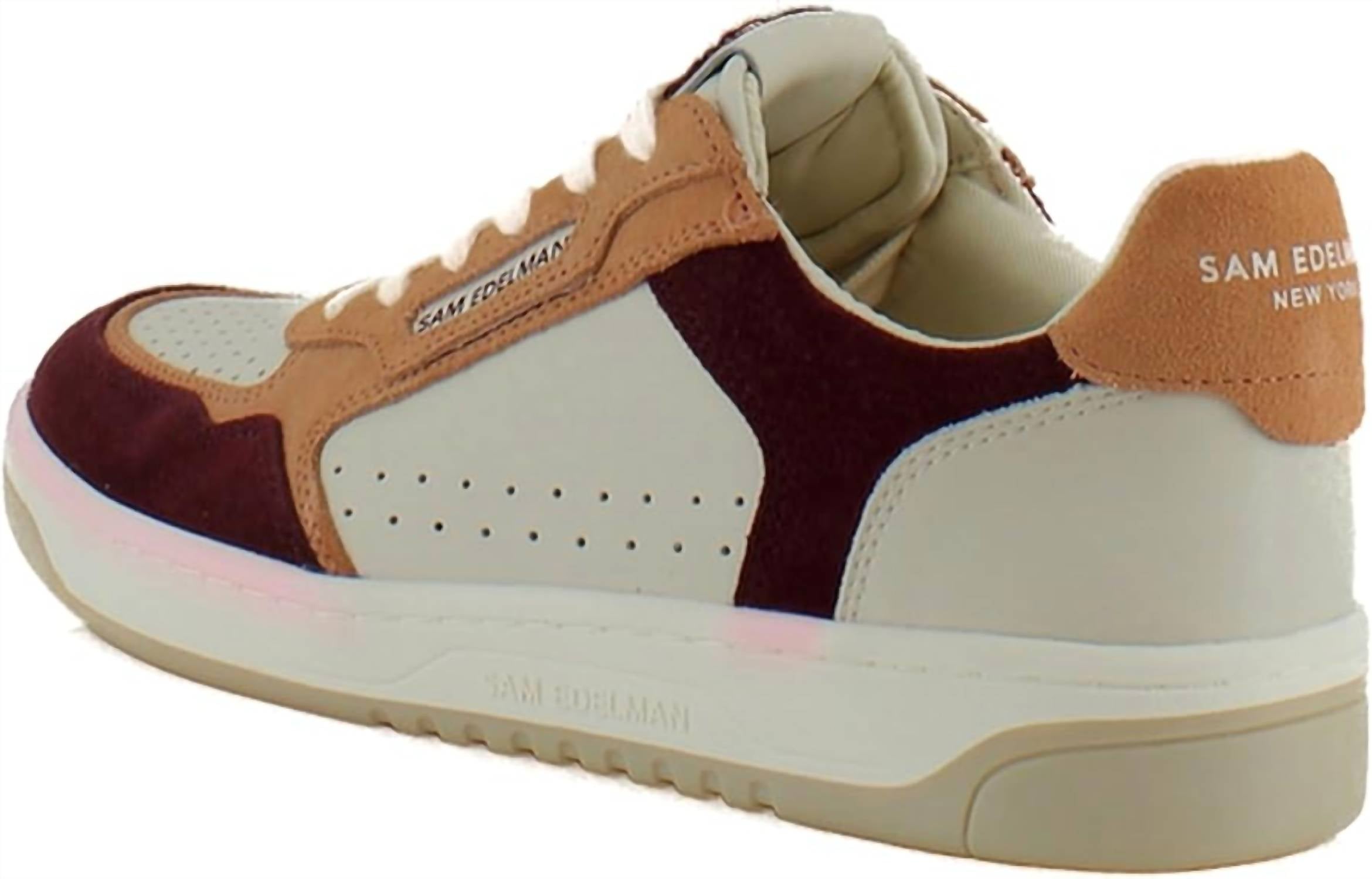 Get your daily steps in with these adorable sneakers. Introducing the Women's Harper Sneaker by Sam Edelman in a striking Tuscan Clay/French Burgundy colorway. These sneakers feature an almond toe and a 1.12-inch platform heel, perfect for an athleisure-inspired spring look. Crafted from a mix of leather, fabric, and synthetic materials, they ensure both style and durability. Closure: Lace-up. This versatile pair is ideal for travel, bringing a playful nod to old-school skater style with its low-top design and contrast detailing.
