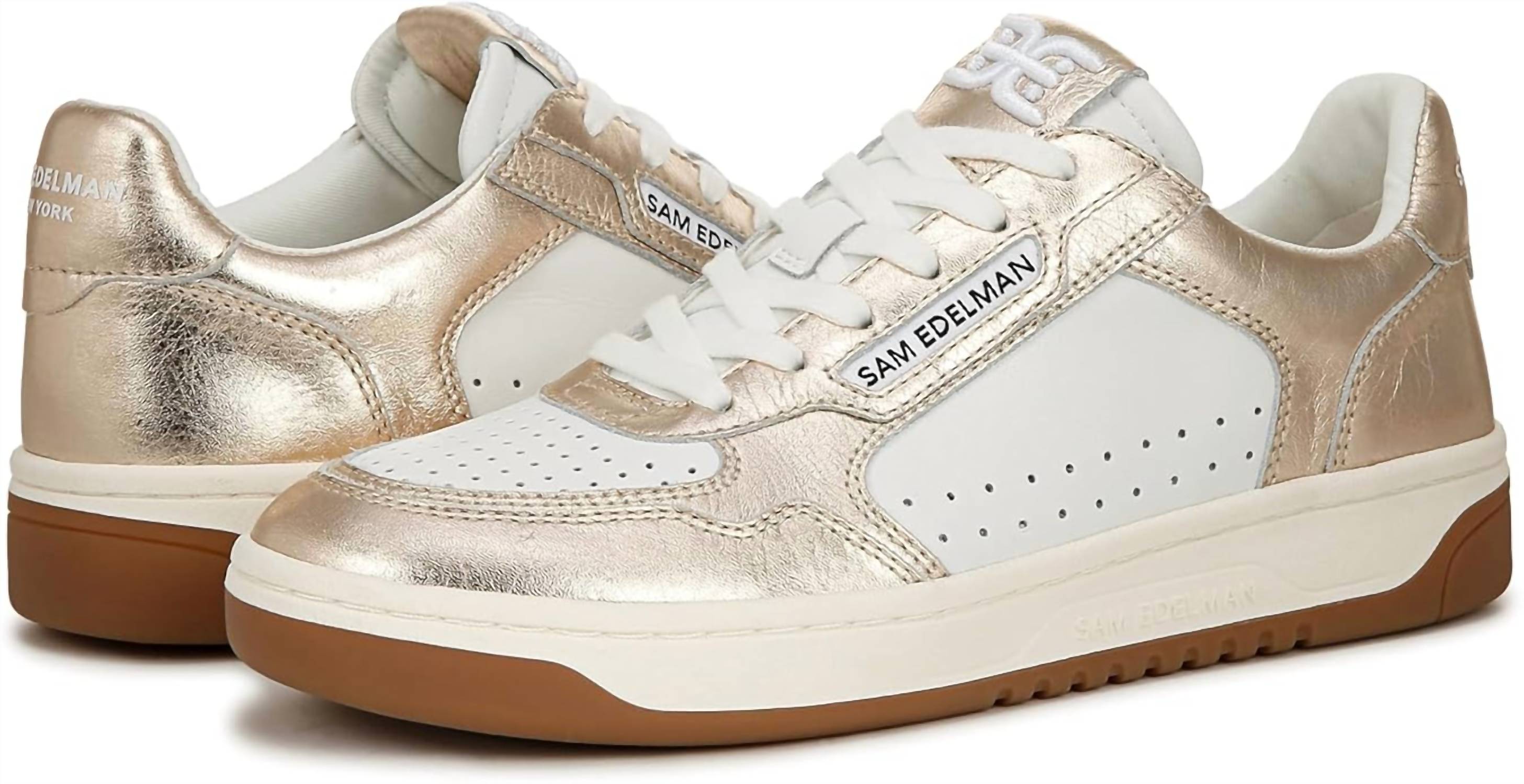 Get your daily steps in with these adorable sneakers. The Women's Harper Sneaker by Sam Edelman is a stylish and minimalist low-top sneaker crafted for adults with a discerning taste. Featuring an almond toe and a heel height of 1.12 inches, this shoe combines comfort with contemporary flair. With a mix of leather, fabric, and synthetic materials, and a synthetic insole, it ensures durability and ease. The lace-up closure and gold leaf leather color make it a perfect travel companion for the summer season.