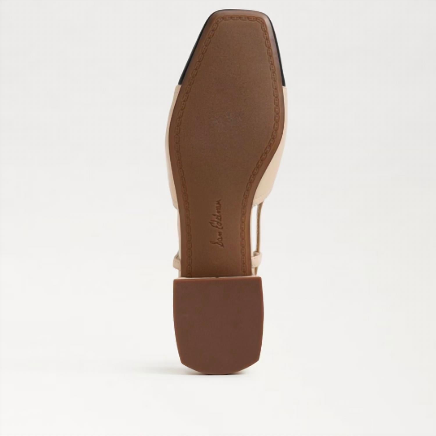 A preppy yet feminine take on the classic loafer. Sam Edelman's Women's Kara Slingback Flats in sand and black offer a chic yet casual look perfect for any occasion. The flats feature a distinctive square toe and a classic slingback silhouette enhanced by a convenient buckle closure. Crafted from a blend of leather, synthetic, and fabric materials, these flats have a comfortable synthetic insole and a stylish 1-inch flat heel. Ideal for springtime or a music festival, they bring a 90s fashion vibe with a versatile touch.