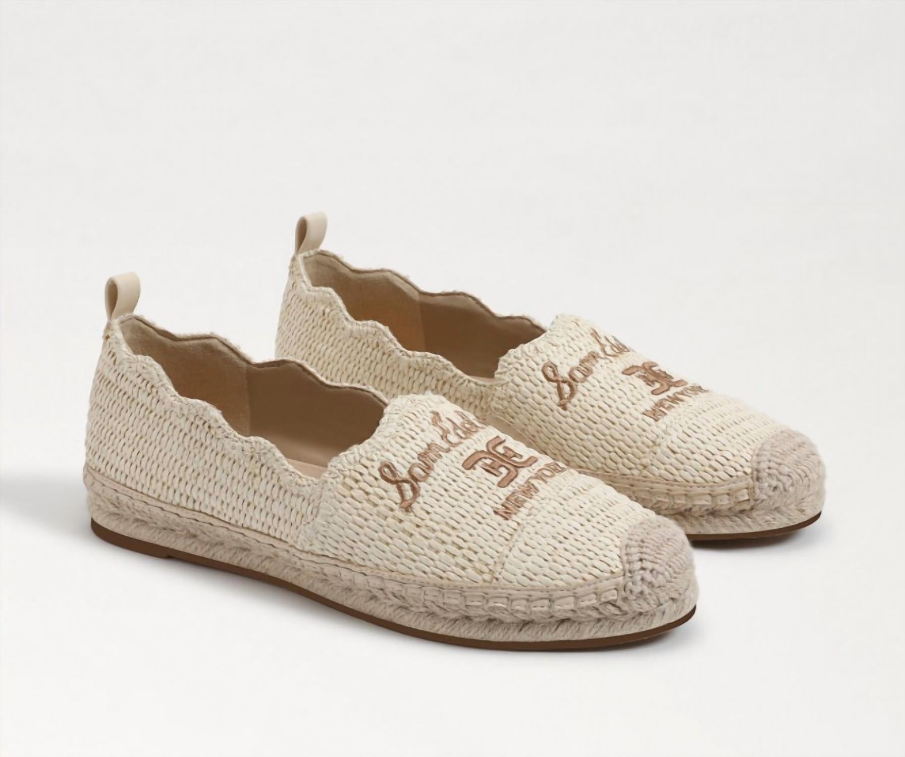 Pair these with white denim or your favorite day dress. Meet the Women's Karla Espadrille Flat Loafer by Sam Edelman in Linen, designed with a chic rounded toe and a comfortable 1-inch platform height. Crafted from fabric and other materials, these slip-on espadrilles feature an allover woven nautical style with scalloped details, espadrille soles, and elegant logo embroidery. The synthetic insole provides comfort, making them an ideal choice for summer travel and light, casual occasions. Perfectly paired with cropped pants or summer-weight sweaters for a minimalist, stylish look.