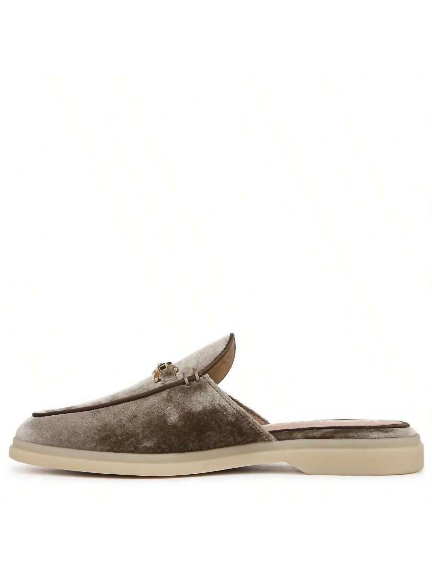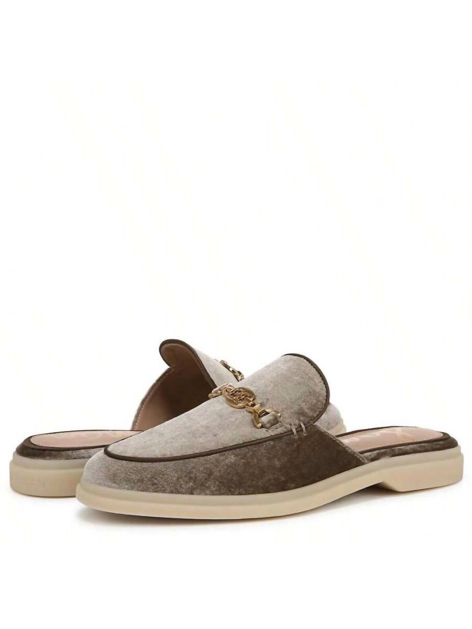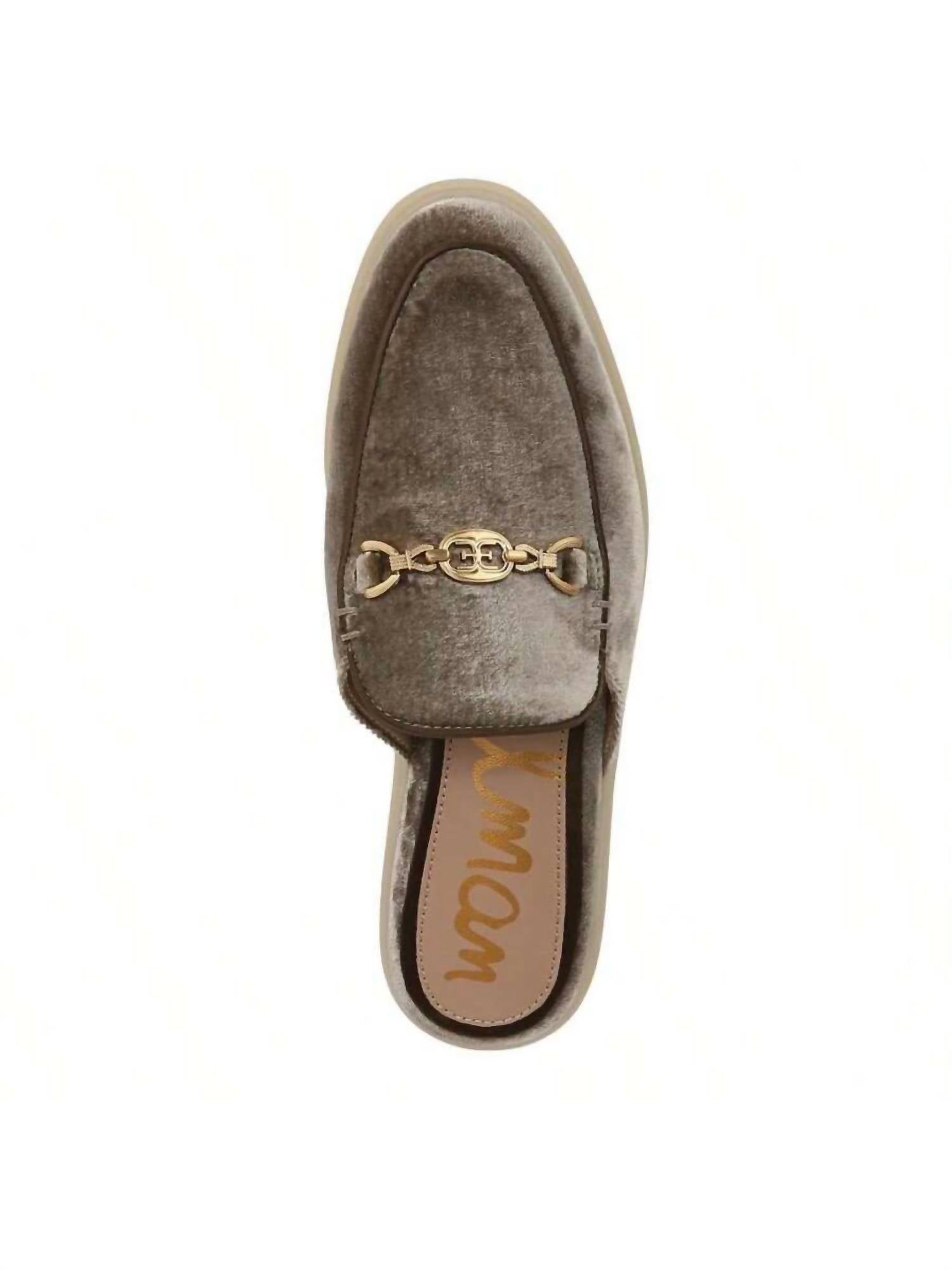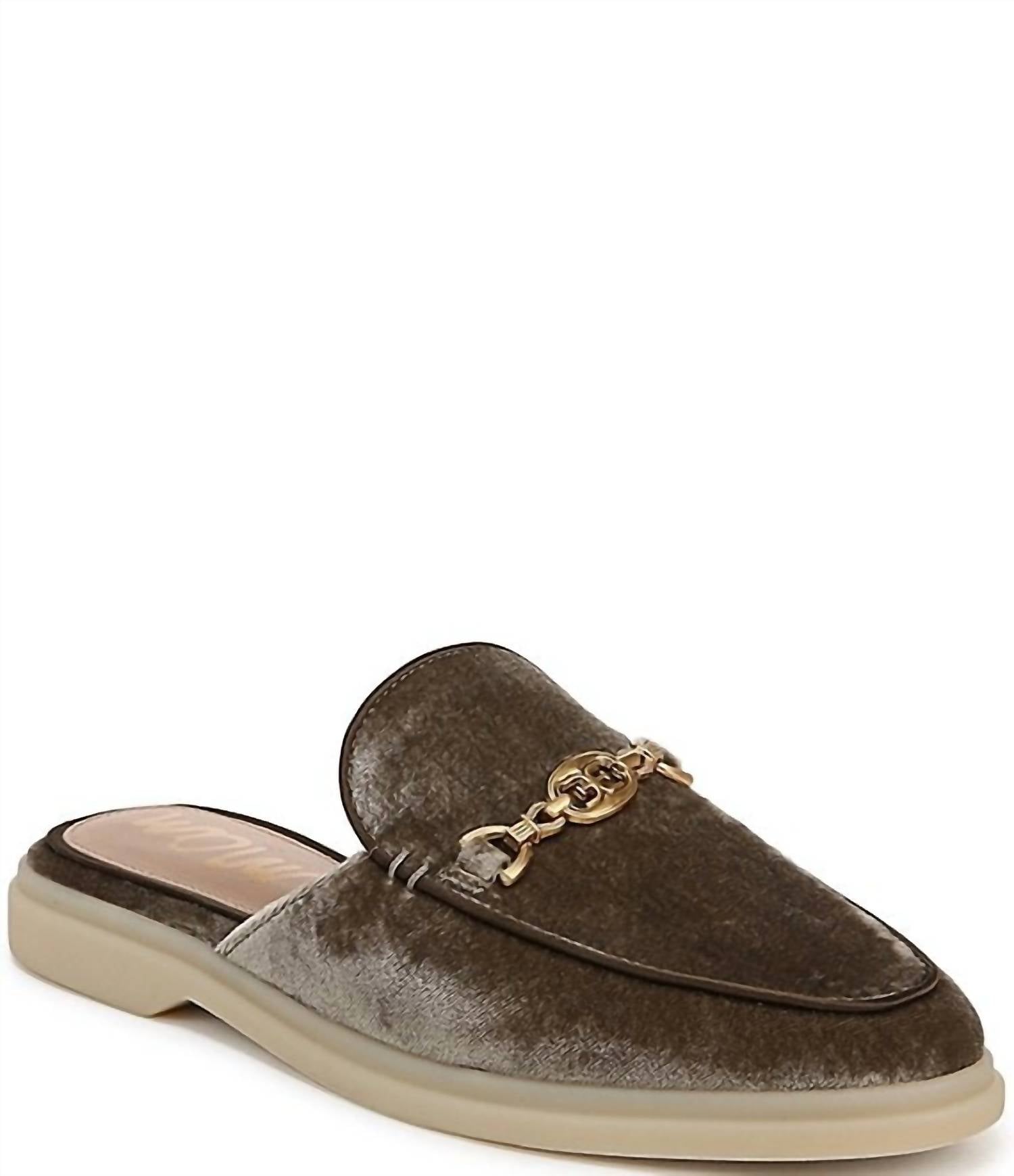 Slip them on and go! Step into fall fashion with the Women's Kira Bit Mule by Sam Edelman in Dark Silver Sage. These rich loafers feature a chic almond toe and a stylish logo bit detail. Crafted from leather, fabric, and suede, they rest on a 0.75-inch flat heel, making them an ideal choice for workwear or travel. With a convenient slip-on closure and synthetic insole, these mules are a perfect addition to any autumn wardrobe.