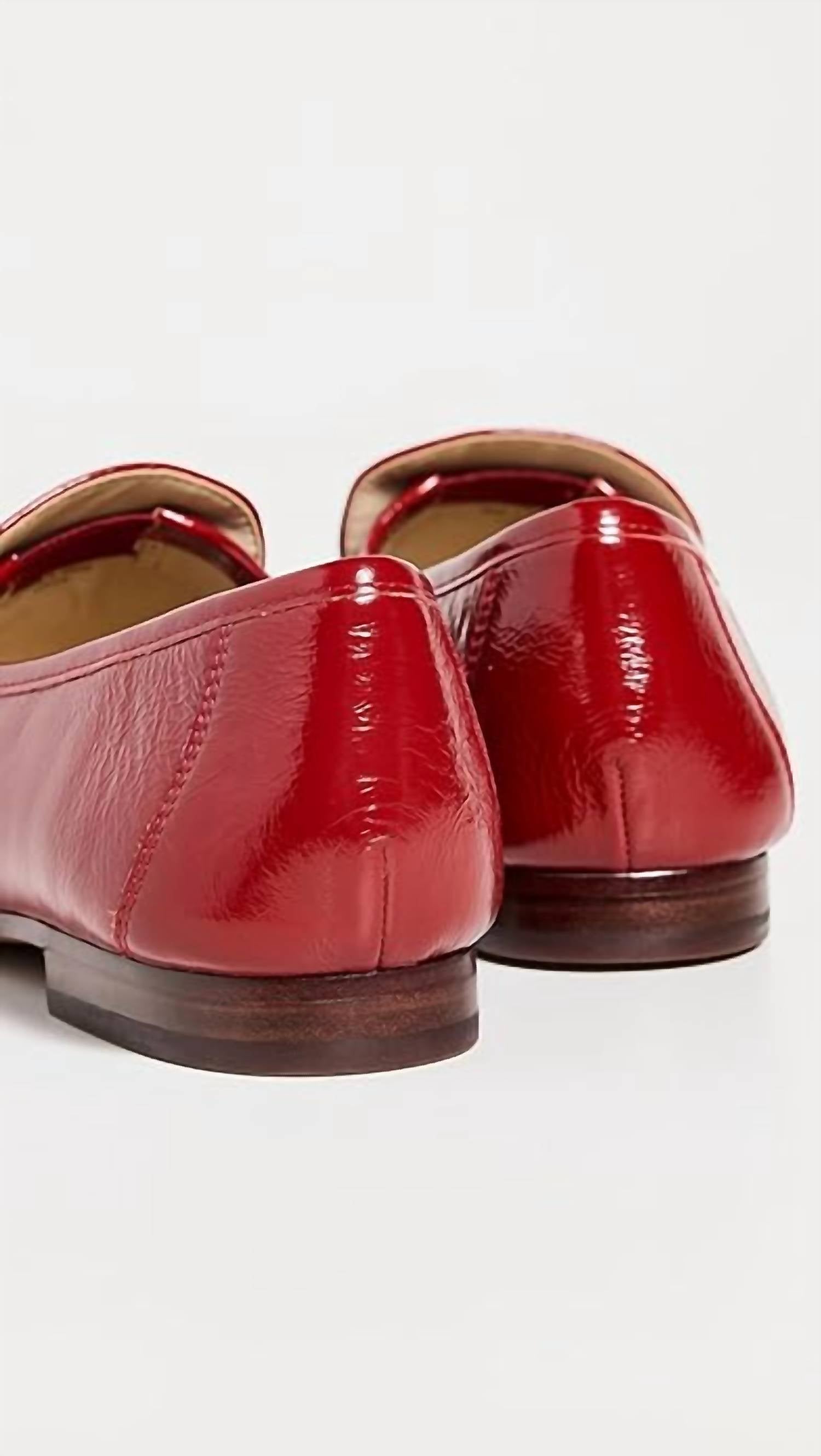 Step into sophistication with the Women's Lucca Bit Loafer by Sam Edelman, crafted to evoke '80s vintage charm. These deep scarlet loafers feature an almond toe and faux patent leather upper, complemented by luxurious gold hardware and side ruching. Designed for comfort and style, the loafers include a leather blend footbed and lining, ensuring a premium feel with every step. The easy-on, easy-off style is perfected with a 10 mm (0.5 inch) flat heel, perfect for fall and suitable for workwear or travel.