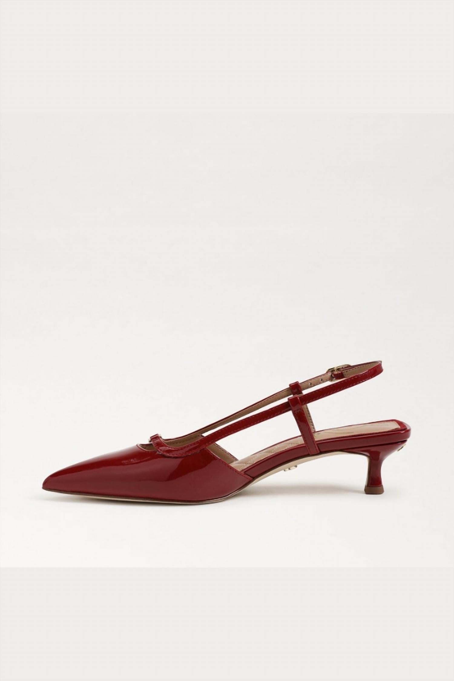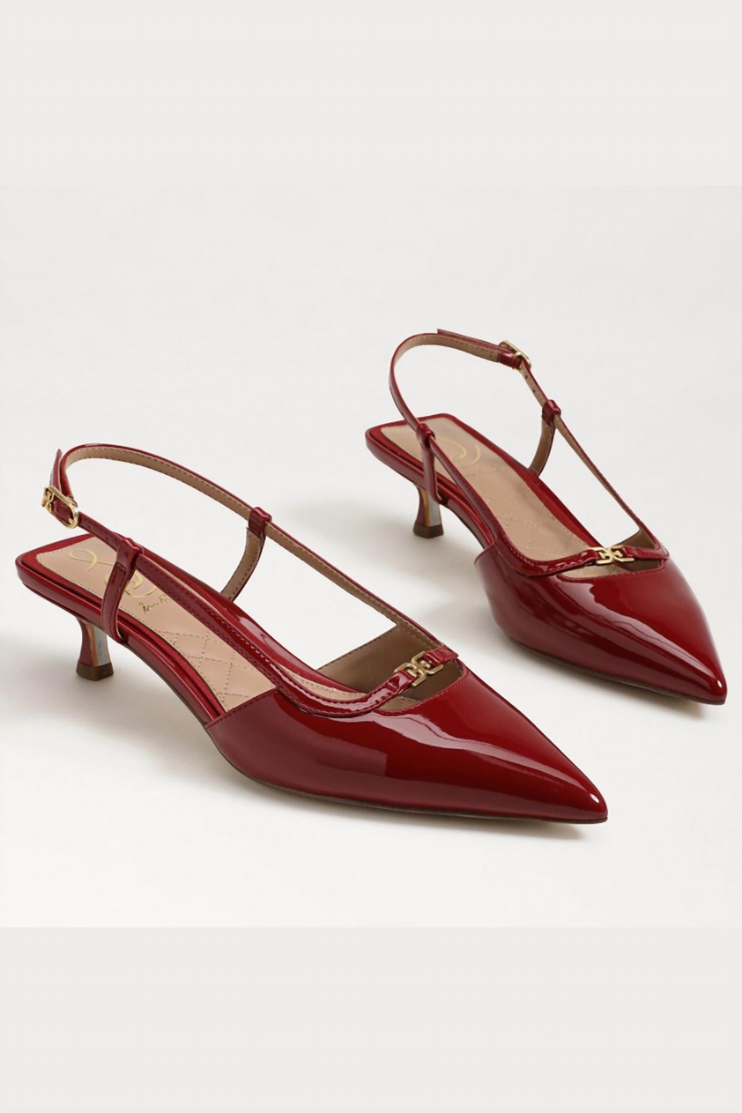 Don't be deceived, these heels are comfy as can be. Introducing the Women's Toni Slingback Kitten Heel by Sam Edelman, an embodiment of elegance in captivating Deep Scarlet Red Patent. Crafted from luxurious patent leather with a synthetic insole, these pumps feature a chic pointed toe design that elevates any outfit. The 1.6-inch kitten heels offer both style and comfort, making them ideal for everything from in-office sophistication to evening events. Perfect for occasions like Valentine's Day, these heels promise to enhance your fashionista flair with every step.