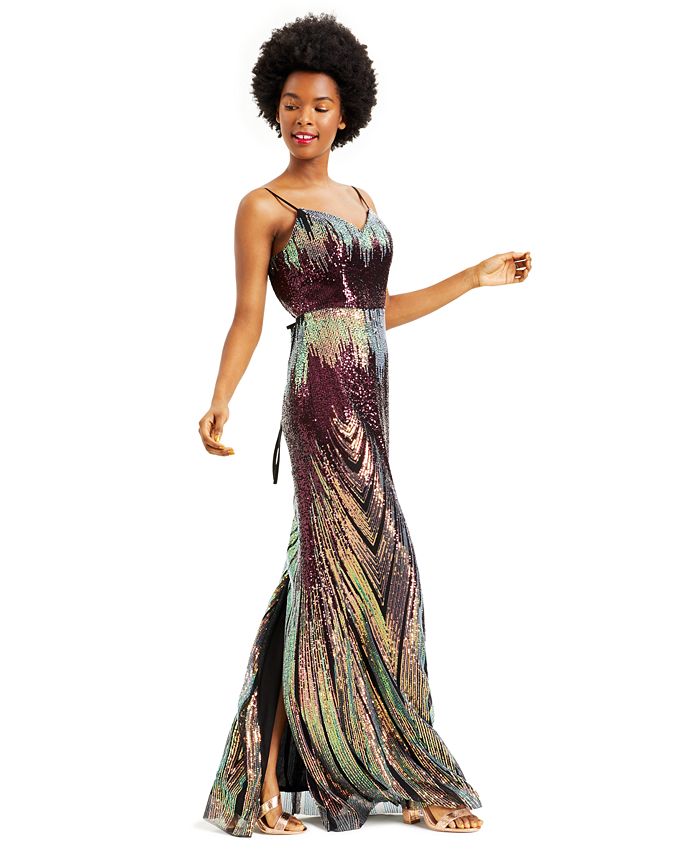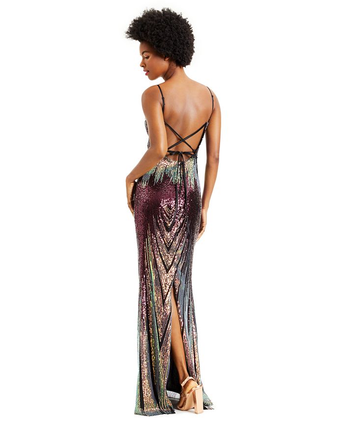 Sequins create a multicolored effect on this absolutely stunning evening gown by Teeze Me. Its open back is an alluring finishing touch.| Approx. 62 long from center back neck to hem. Length is based on size 7 and varies 1/2 between sizes | V-neck| Back zipper closure| Adjustable spaghetti straps| Padded bra cups; allover sequins; open back with crisscross straps
