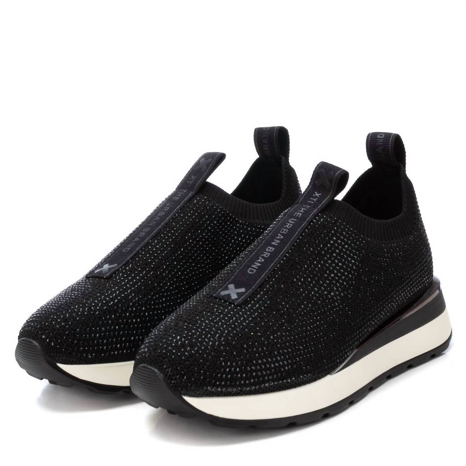 Get your daily steps in with these adorable sneakers. Step up your style with the Women's Casual Sneakers by Xti, designed in chic black for a versatile look. Crafted with a polyester fabric upper adorned with decorative rhinestones, these trainers feature a breathable and padded insole for enhanced comfort. The sneakers boast adjustable laces and a thick, non-slip rubber sole, perfect for daily wear. Enjoy the convenience of a removable insole and the assurance that these shoes are PETA-certified vegan.