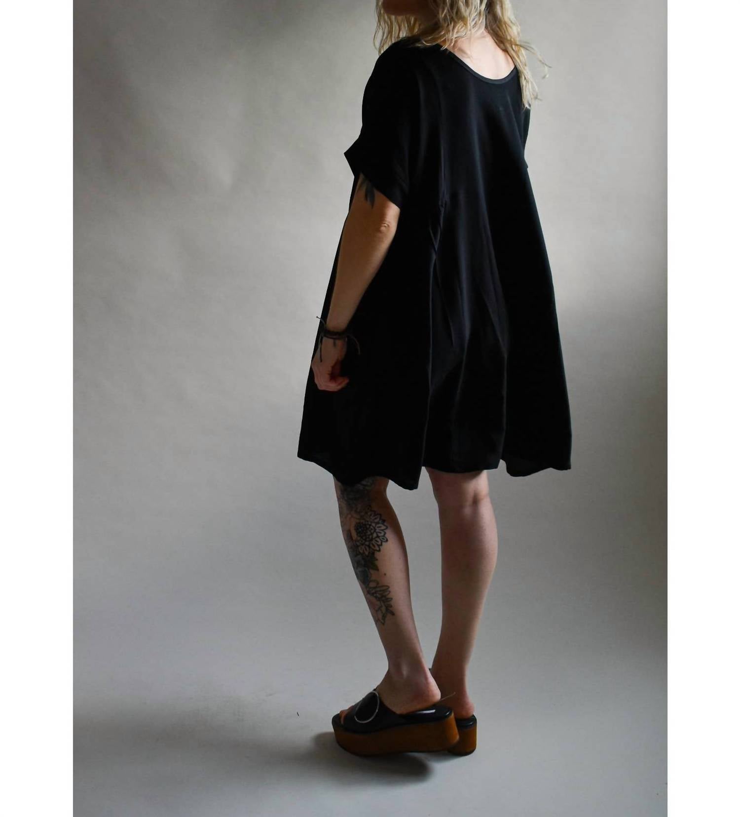 Introducing the Krista Mini Dress by Altar, a chic and sustainable choice for your wardrobe. Made from super soft and lightweight chalice rayon, this black shift dress features short sleeves and a scoop neckline. With a pull-on closure and a silhouette enhanced by adorable side gathers, it drapes beautifully for vacation-ready style. Handmade in Portland, OR, this piece embraces zero-waste techniques with remnant fabric use.