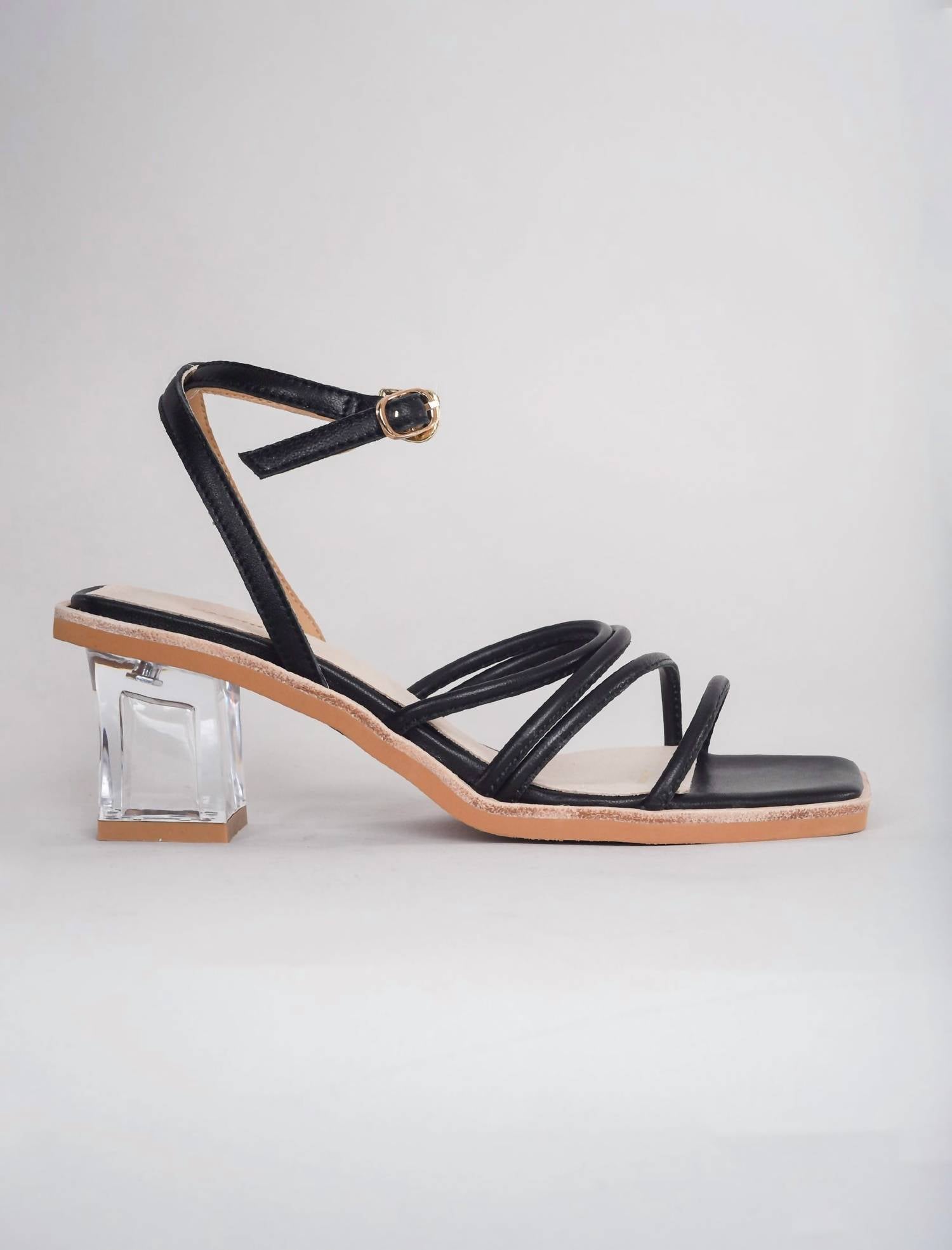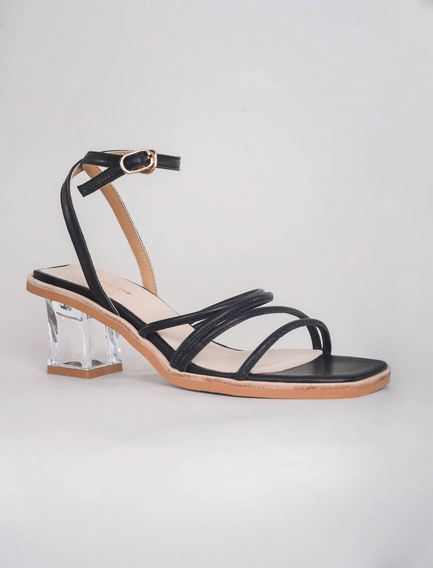 This sandal will take you from brunch to dinner and everything in between. A strappy little heel for all your summertime events! It features a clear plastic heel and leather uppers, with a buckle-loop closure at the ankle strap. We find these are running true to size. Heel height: 2 inches. Leather uppers. Synthetic outsole. Made in Italy.