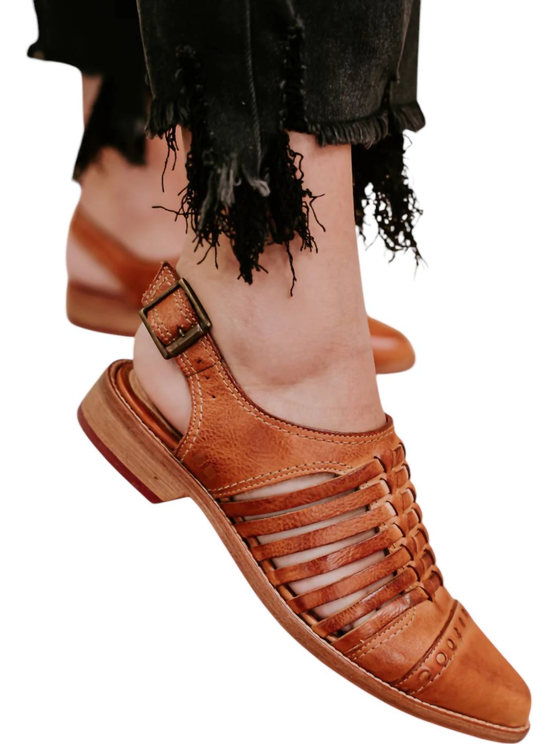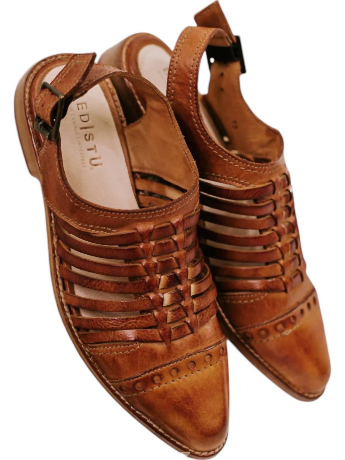 This sandal will take you from brunch to dinner and everything in between. Chrome and formaldehyde free. Vegetable tanned leather upper. Woven pointed toe sling back flat. Cushioned insole. Red leather lined. Cap toe with perforations. 1 in leather stacked heel. Leather outsole. Handmade in Leon Mexico.