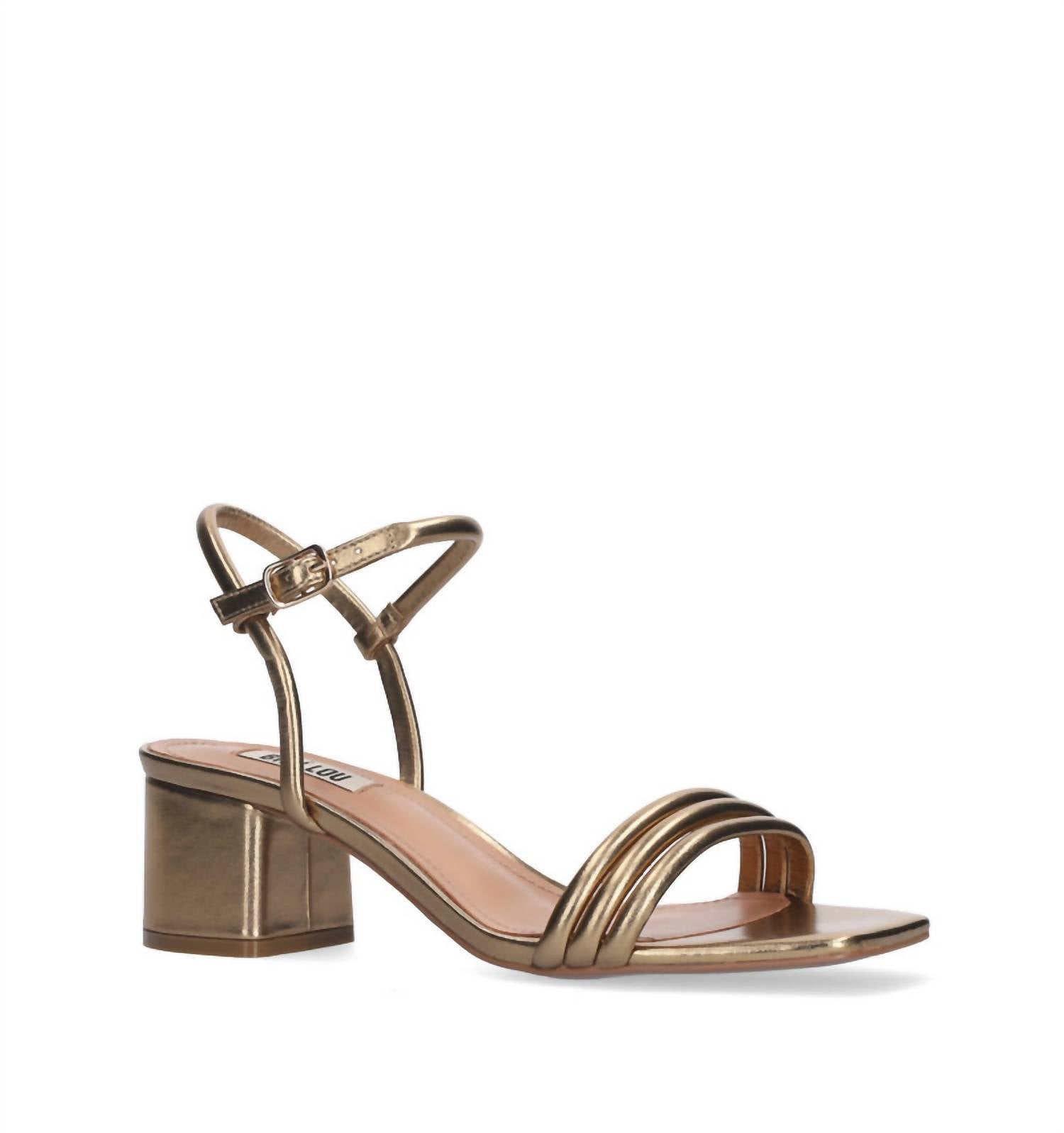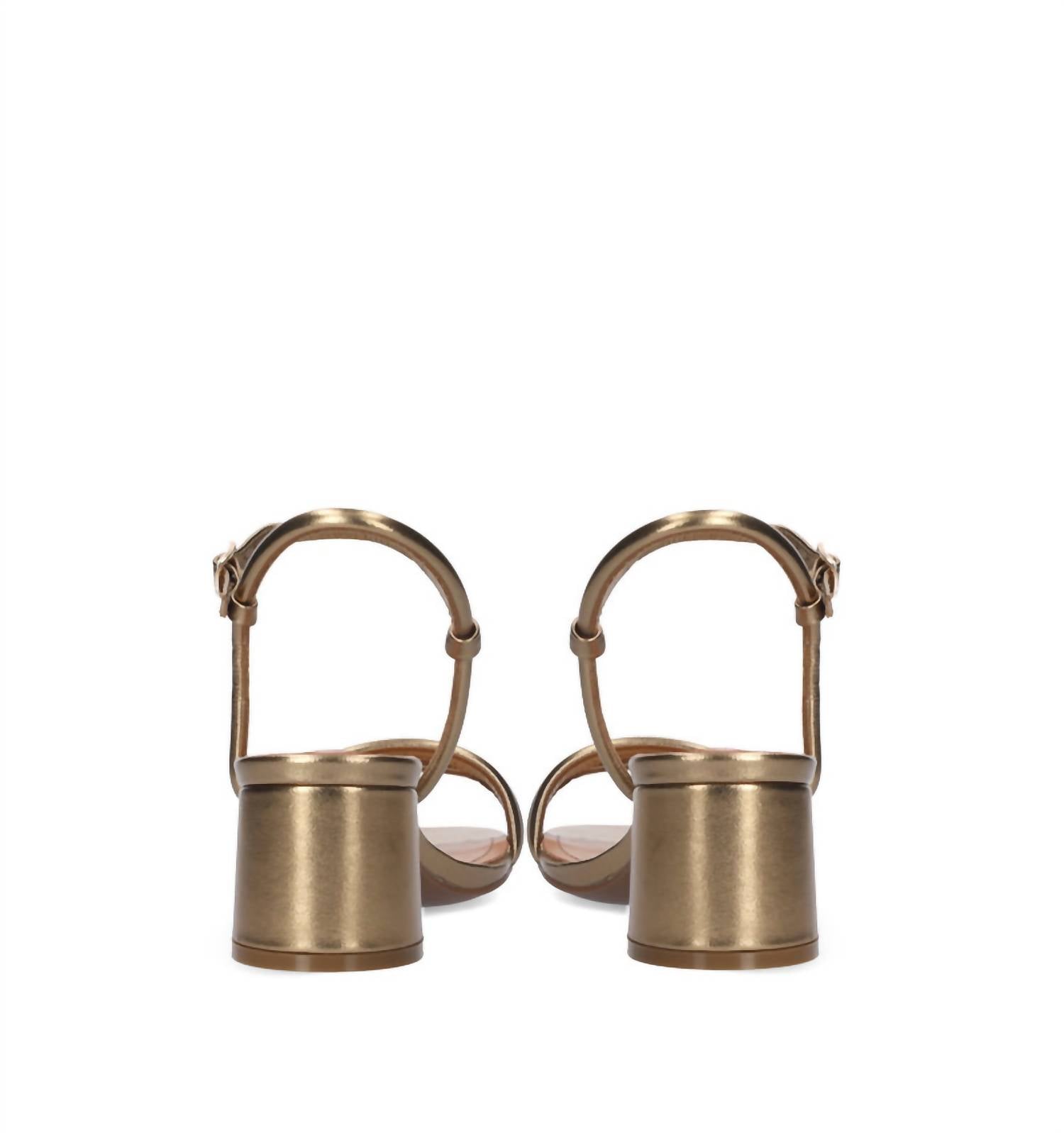 This sandal will take you from brunch to dinner and everything in between. Step out in style with the Women's Erica Metallic Sandals by Bibi Lou, featuring gleaming gold leather for a luxurious touch. Designed with three front straps and an adjustable side buckle across the instep, these sandals offer both security and style. The open-toe design rests atop a wide, lined block heel of approximately 4.5 cm and a padded insole measuring about 0.5 cm. Perfect for evening events, these sandals seamlessly blend comfort and elegance for your spring workwear collection.