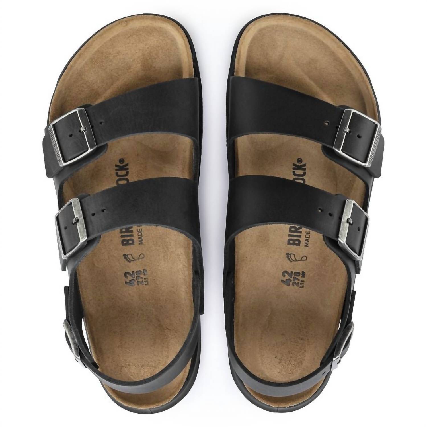 Presenting the Men's Milano Rugged Sandals by BIRKENSTOCK, crafted for those who seek comfort and durability. Made from exquisite oiled nubuck leather, these black sandals feature a distinctive backstrap with two adjustable metal pin buckles for a personalized fit. The anatomically shaped cork-latex footbed, paired with suede lining and a PU sole, ensures a cushioned step with enhanced traction. Proudly made in Germany, these sandals are perfect for outdoor adventures with their open toe and flat heel design.