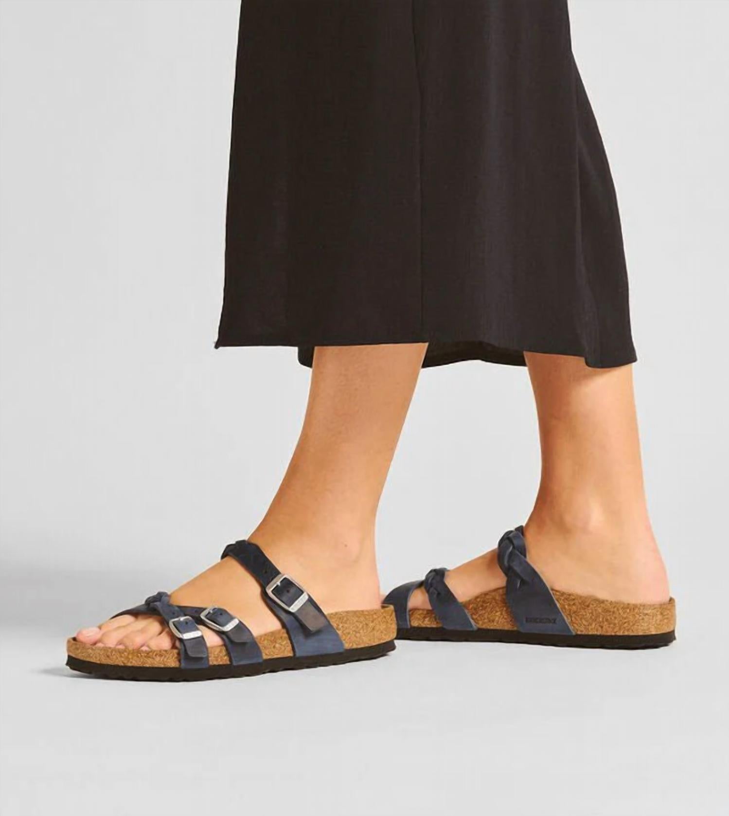 Introducing the Women's Franca Oiled Leather Sandals by BIRKENSTOCK, a stylish addition to your summer wardrobe with a boho chic vibe. These navy sandals feature an oiled leather upper with a braided design and an open toe shape, offering a perfectly lived-in look that ages beautifully. They are crafted in Germany, boasting a contoured cork-latex footbed and suede lining for custom support and comfort. Enjoy the lightweight and flexible EVA sole, complemented by three adjustable metal pin buckle straps for a secure fit. Ideal for vacation wear, these sandals sport a flat heel measuring under 1", perfect for all-day wear.