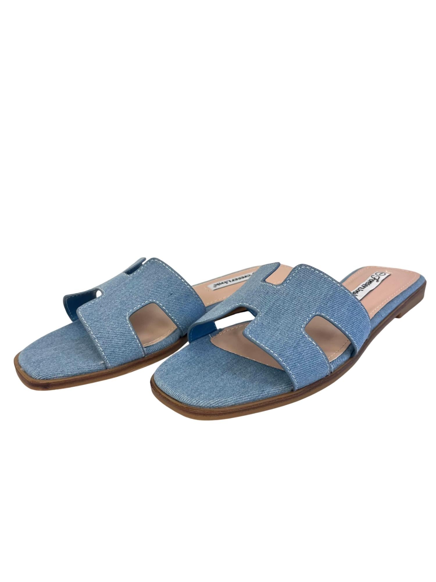 Flowy dresses, cropped pants, and even jumpsuits... this sandal works with them all! H-shape cut-out design in blue denim fabric. Slip-on style sandal with semi-square-toe.
