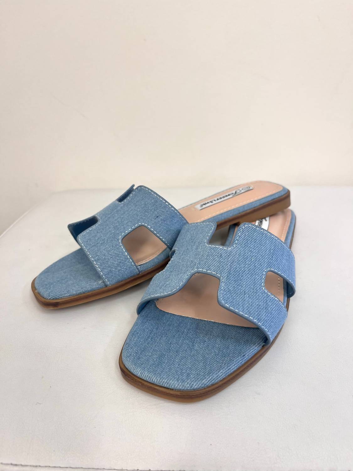 H-shape cut-out design in blue denim fabric. Slip-on style sandal with semi-square-toe.