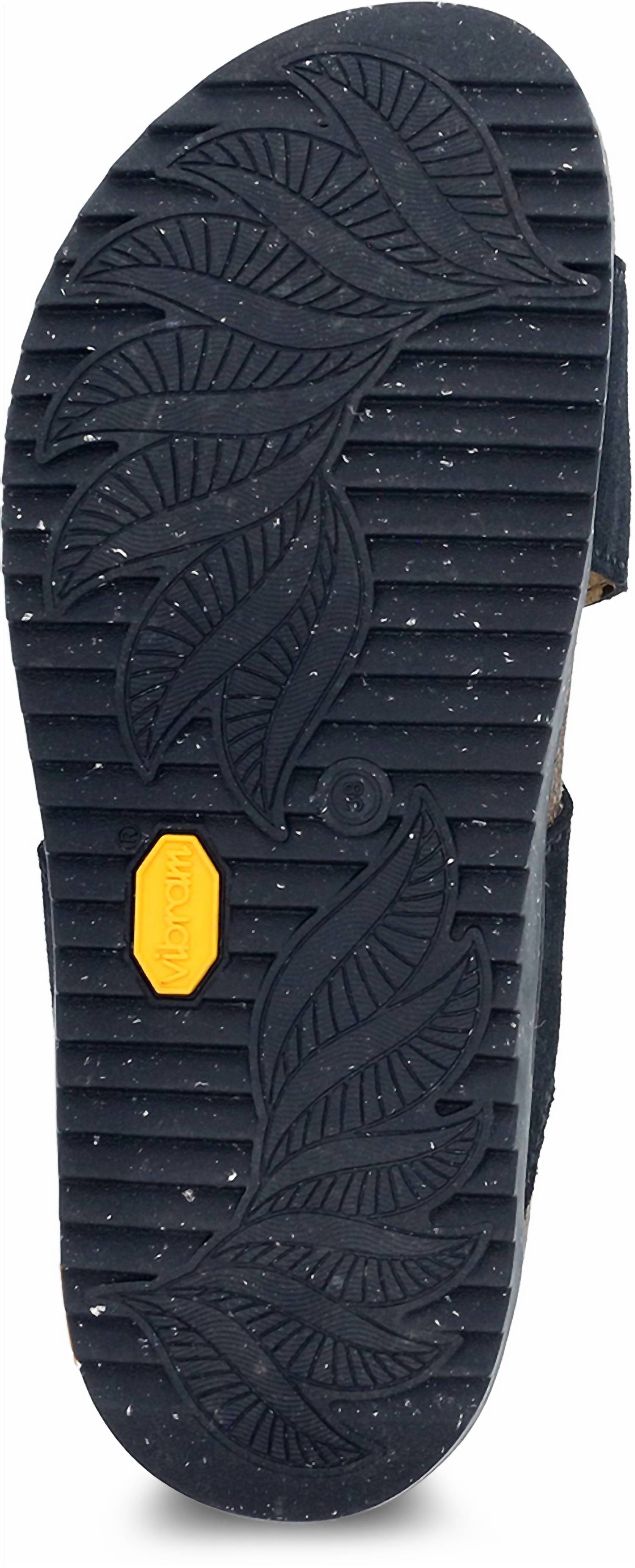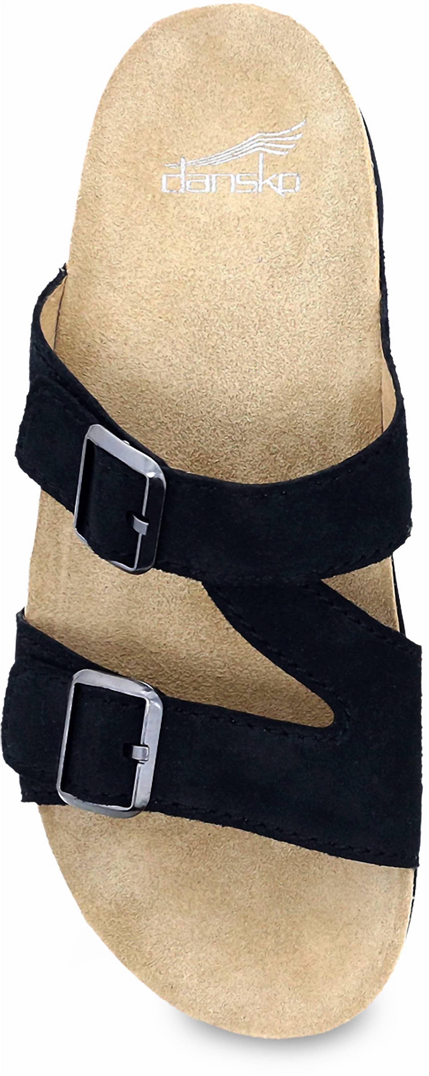 This sandal will take you from brunch to dinner and everything in between. Introducing the Women's Dayna Suede Sandals by Dansko, a sophisticated choice in sleek black. Crafted with chrome-free suede uppers and leather linings, these sandals ensure all-day comfort. The dual-density cork/EVA midsole offers lightweight cushioning, enhanced by a Vibram ECOSTEP EVO rubber outsole, utilizing a minimum of 30% recycled Vibram rubber for added sustainability. Complete with APMA Seal of Acceptance and a comfortable low heel height of 1"-1.75", these sandals are a smart footwear investment.