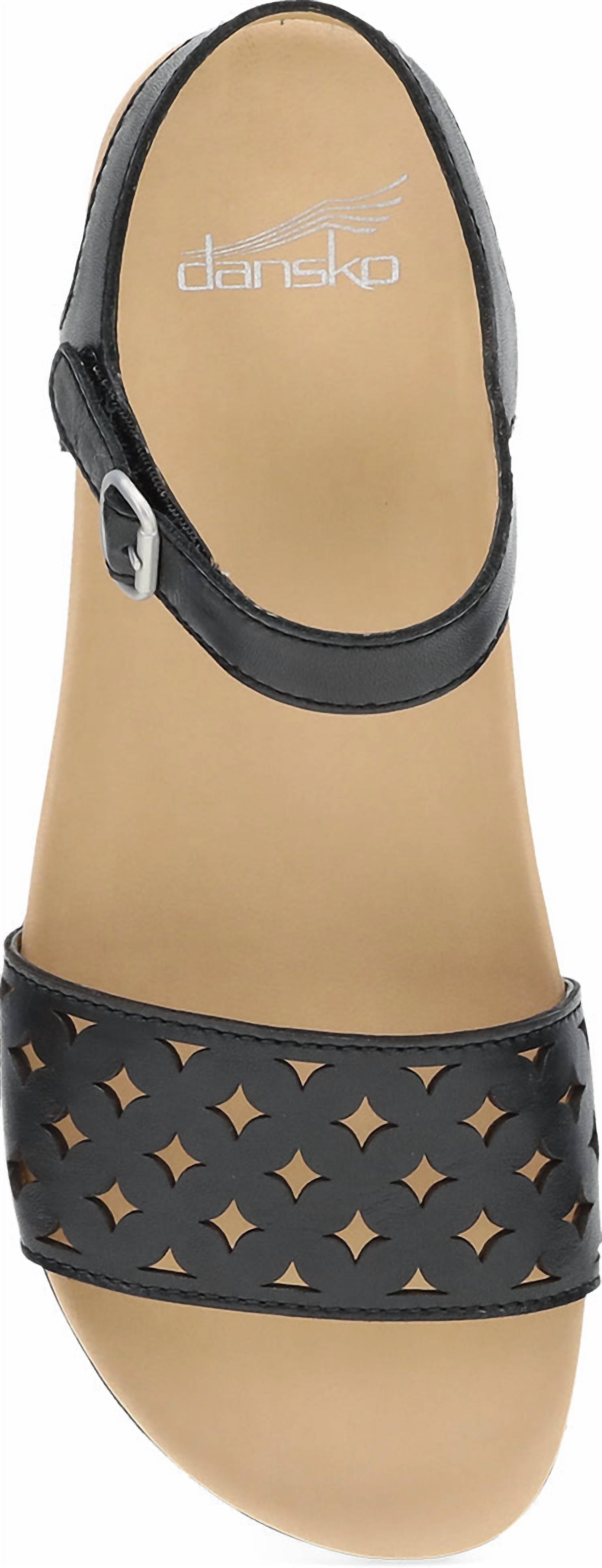 Experience style and comfort with the Women's Jodie Flat Sandal by Dansko in classic black. This elegant flat sandal features a high-quality leather upper and chrome-free leather lining. The nubuck socklining ensures a soft underfoot feel, while the contoured dual-density EVA footbed provides full-foot support. With lightweight rubber outsoles and a convenient hook & loop closure, these sandals offer long-lasting wear and a heel height of 1 inch for minimalist summer style. Ideal for occasions like church, these open-toe beauties are a perfect Mother's Day gift.