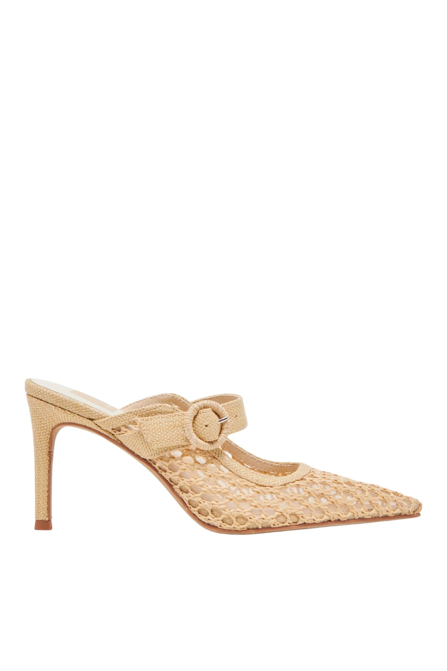 Don't be deceived, these heels are comfy as can be. Step into elegance with the Women's Keekee Sandal by Dolce Vita, a chic choice for evening events. These stylish stiletto mules feature a pointed toe and a woven buckle, offering a unique boho-chic vibe in a soothing beige tone. Crafted from synthetic raffia with a recycled synthetic outsole and a textile mesh lining, this shoe prioritizes sustainability in style. With a water-based leather alternative sock and a striking 3.3" heel height, they are a perfect blend of comfort and bold design for your summer wardrobe.