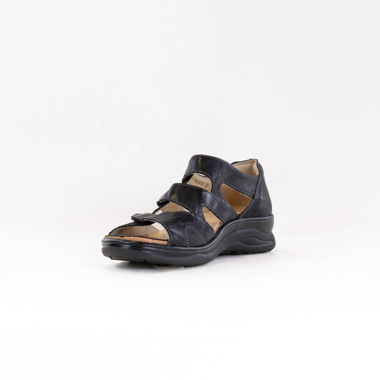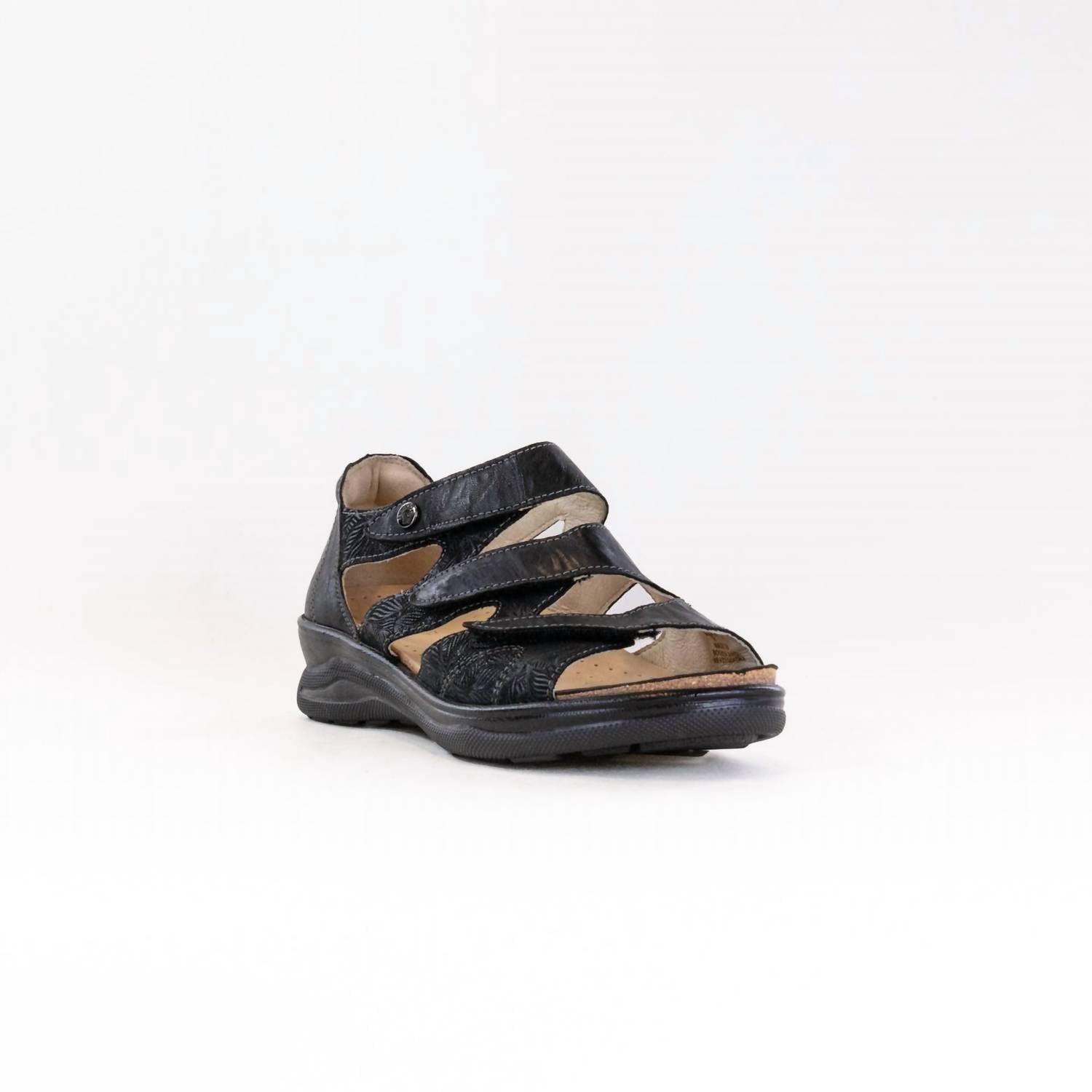 This sandal will take you from brunch to dinner and everything in between. Step into style and comfort with the Women's Hilani Sandal by Fidelio in Black Combi, a perfect pick for any dinner party or casual outing. This minimalist sandal features a flat heel with a 30mm height and an open toe design, ensuring a chic look. Crafted with leather and lined with leather and neoprene, it offers a slip-resistant sole and partially Hallux insert, providing superior comfort and stability. With a removable cork footbed and air-cushioned sole, it is ideal for those who use full orthotics and seek lasting comfort in every step.