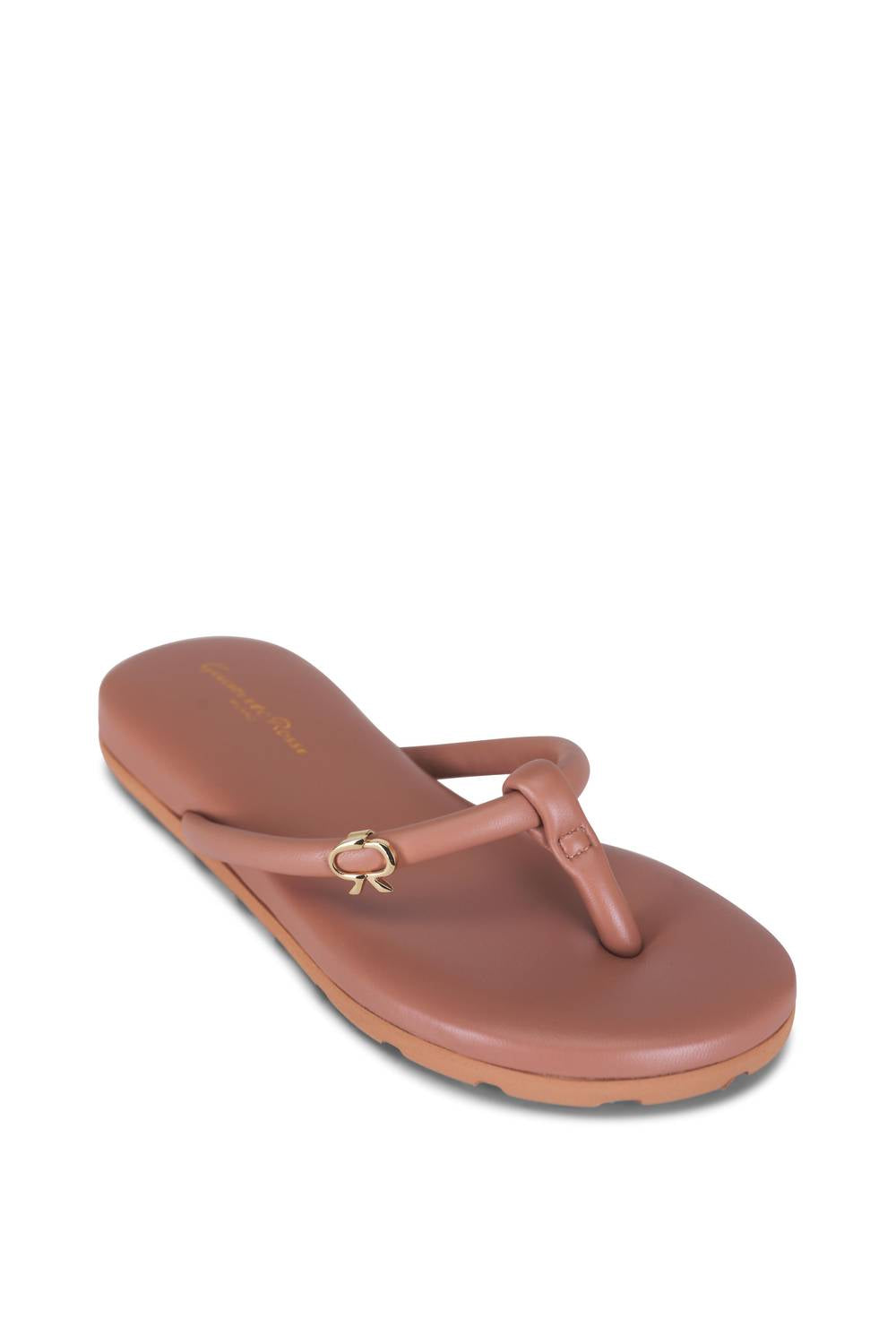 Classicly cute and all-day-wearable. We love this sandal. Step into effortless style with the Women's Fiji Thong Sandal by Gianvito Rossi, a must-have for your vacation wardrobe. The sandals are crafted from 100% nappa leather and feature a flat heel design, perfect for embracing streetwear trends in a praline color. Highlights include a round open toe with padded thong style and a strap at the vamp adorned with gold tone logo hardware. The sandals also boast a treaded rubber sole and a logo stamp at the padded footbed, ensuring both comfort and chic allure.