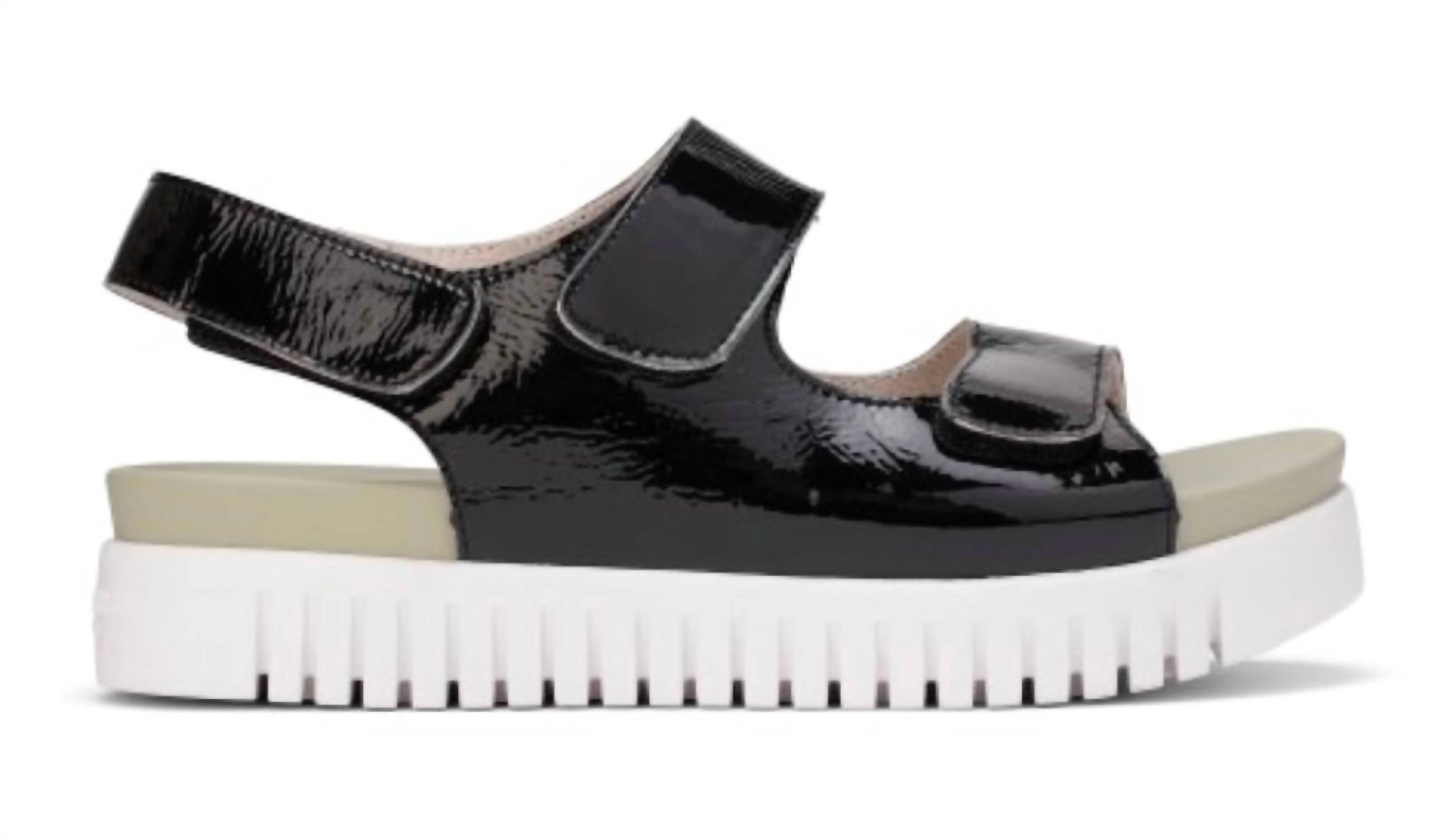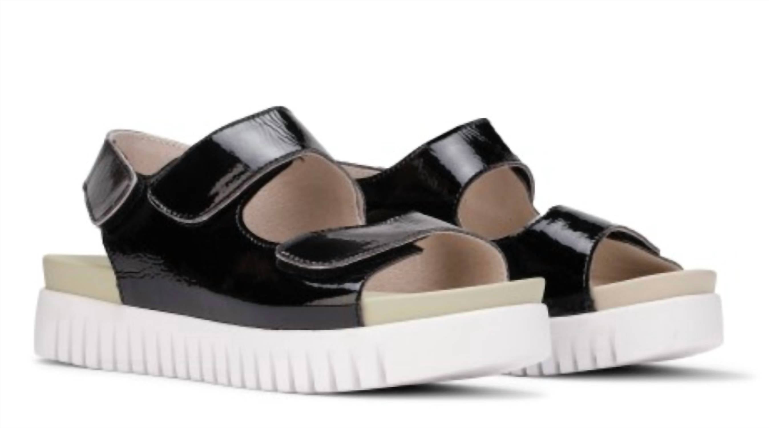 Introducing the Women's Tulip Sandals by Ilse Jacobsen, perfect for a chic streetwear look this Spring. These sandals feature adjustable Velcro straps and an open toe design, providing a comfortable fit that's true to size. With an upper fabric made of glossy PU and lined with pigskin, the sandals offer a luxurious feel. The wedge heel and eco-friendly outsole composed of 75% natural rubber and 25% recycled rubber ensure both style and sustainability.