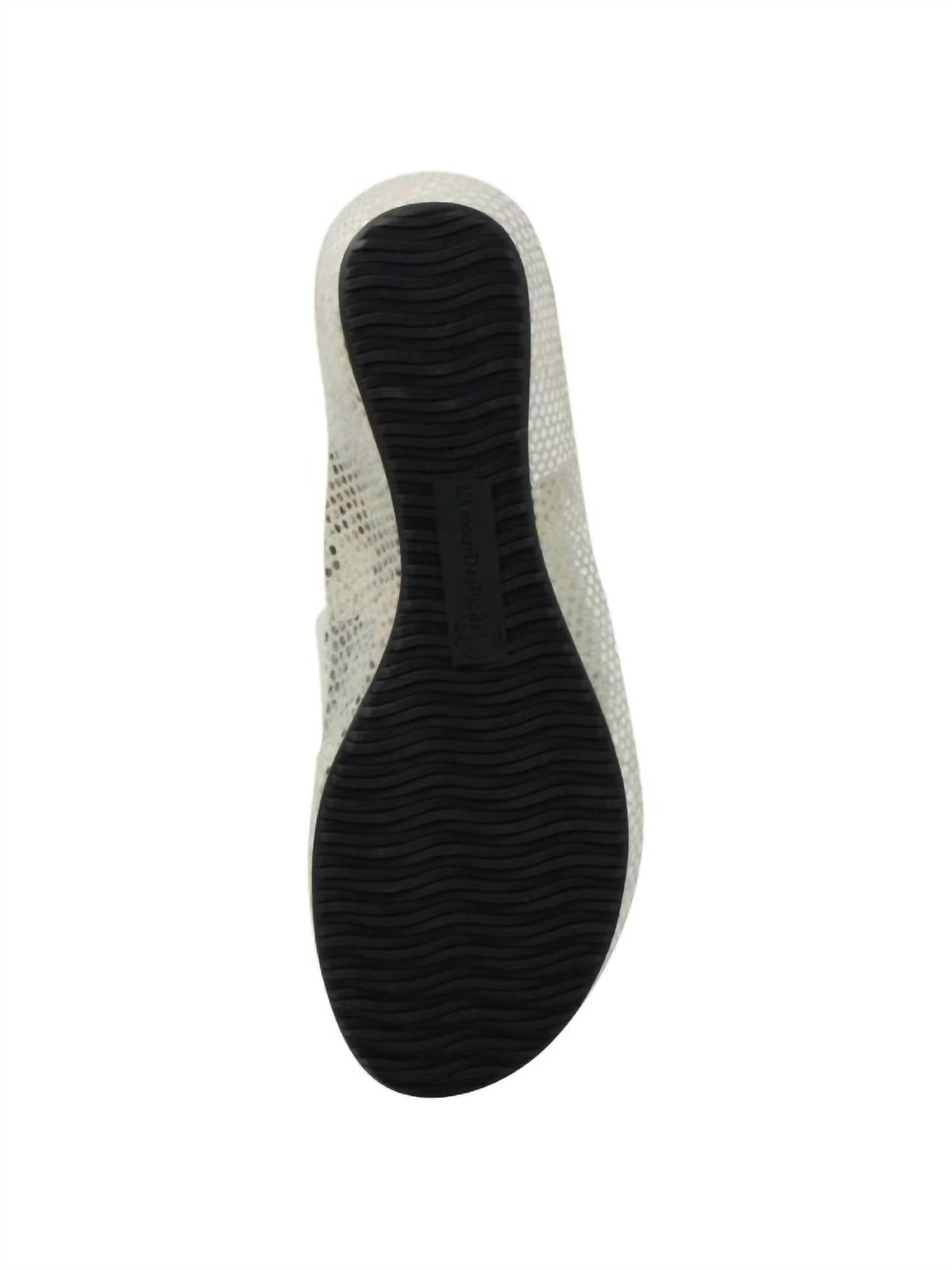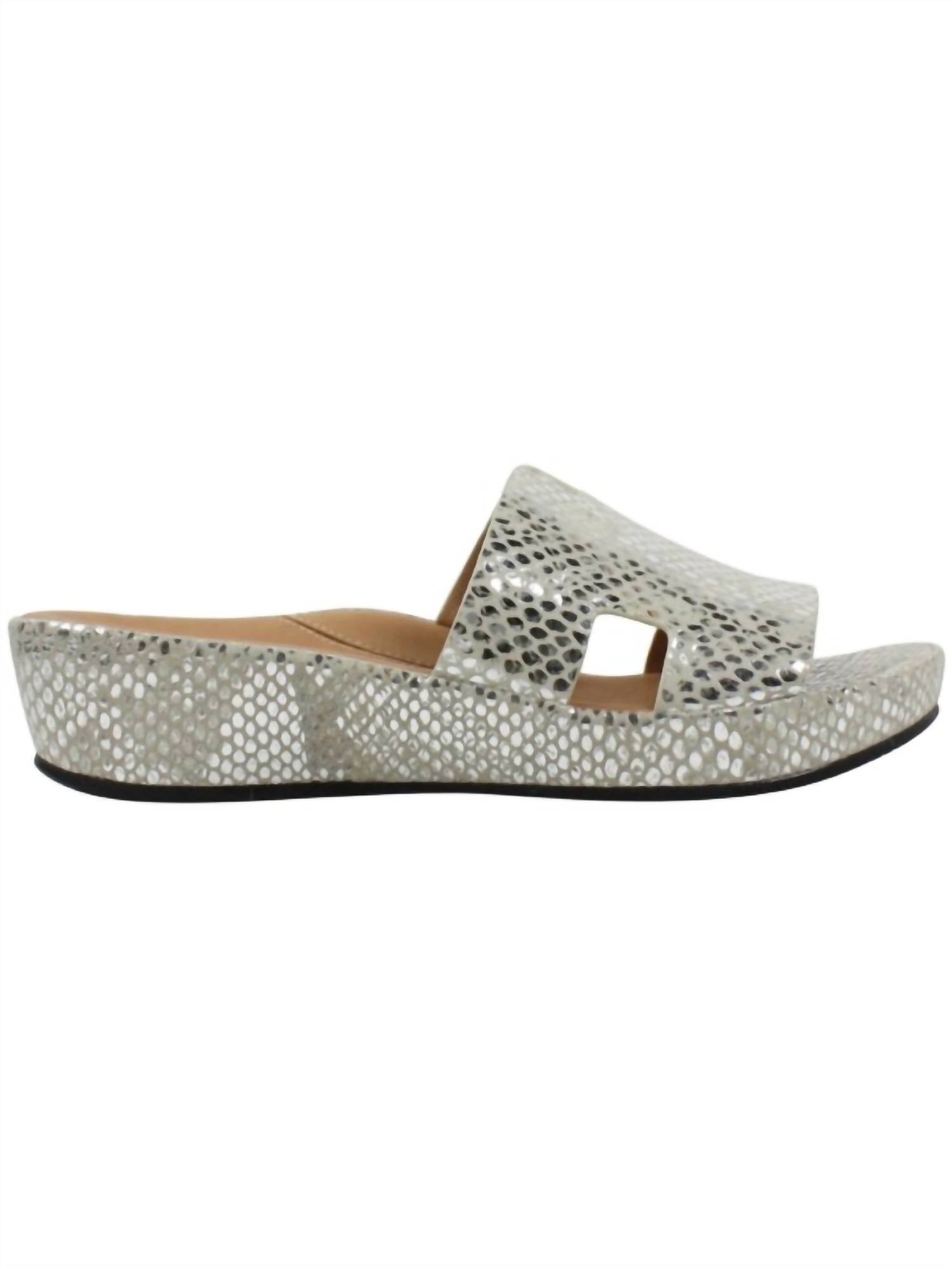 Classicly cute and all-day-wearable. We love this sandal. Introducing the Catiana Sandal by L'amour Des Pieds, a chic women's footwear choice in a stunning Silver Gold Snake Print. These sandals feature an open toe design with a wedge heel style, providing a sleek 1.75-inch heel height. Crafted from snake-embossed leather with a comfortable memory foam insole, leather lining, and a durable synthetic outsole, they are perfect for both casual and dressy occasions. Slip-on design for ease of wear.