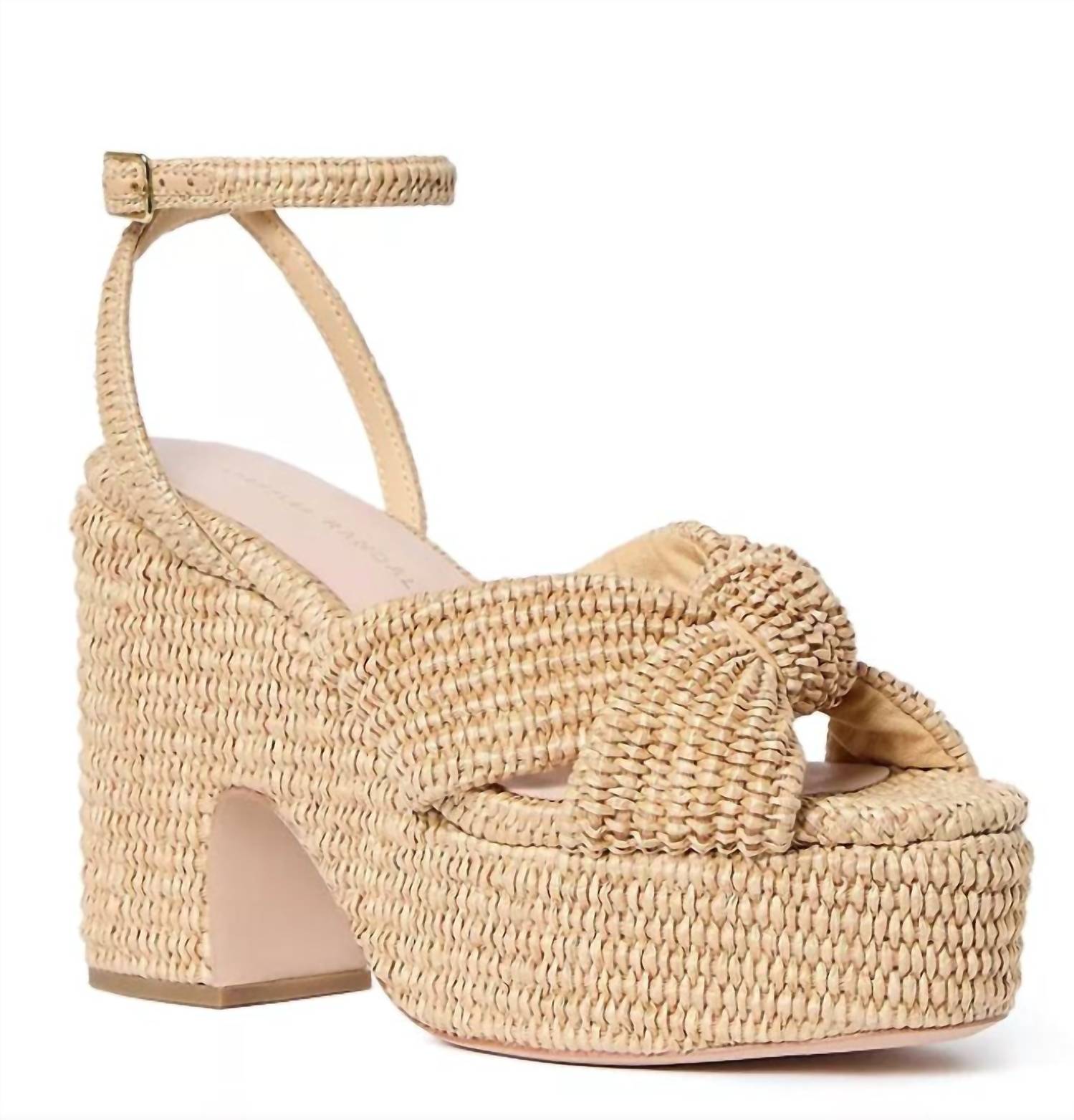 The perfect height for day to night. Step into style with the Liza Chunky Platform Sandal by Loeffler Randall, featuring a luxurious woven raffia design in a natural hue for a boho chic look. These sandals boast a 4.5-inch chunky platform heel and a knotted detail signature to the line, along with an adjustable ankle strap ensuring a perfect fit. The leather outsole promises durability, making it an ideal choice for summer vacations or Mother's Day celebrations. Care: Professional cleaning recommended.