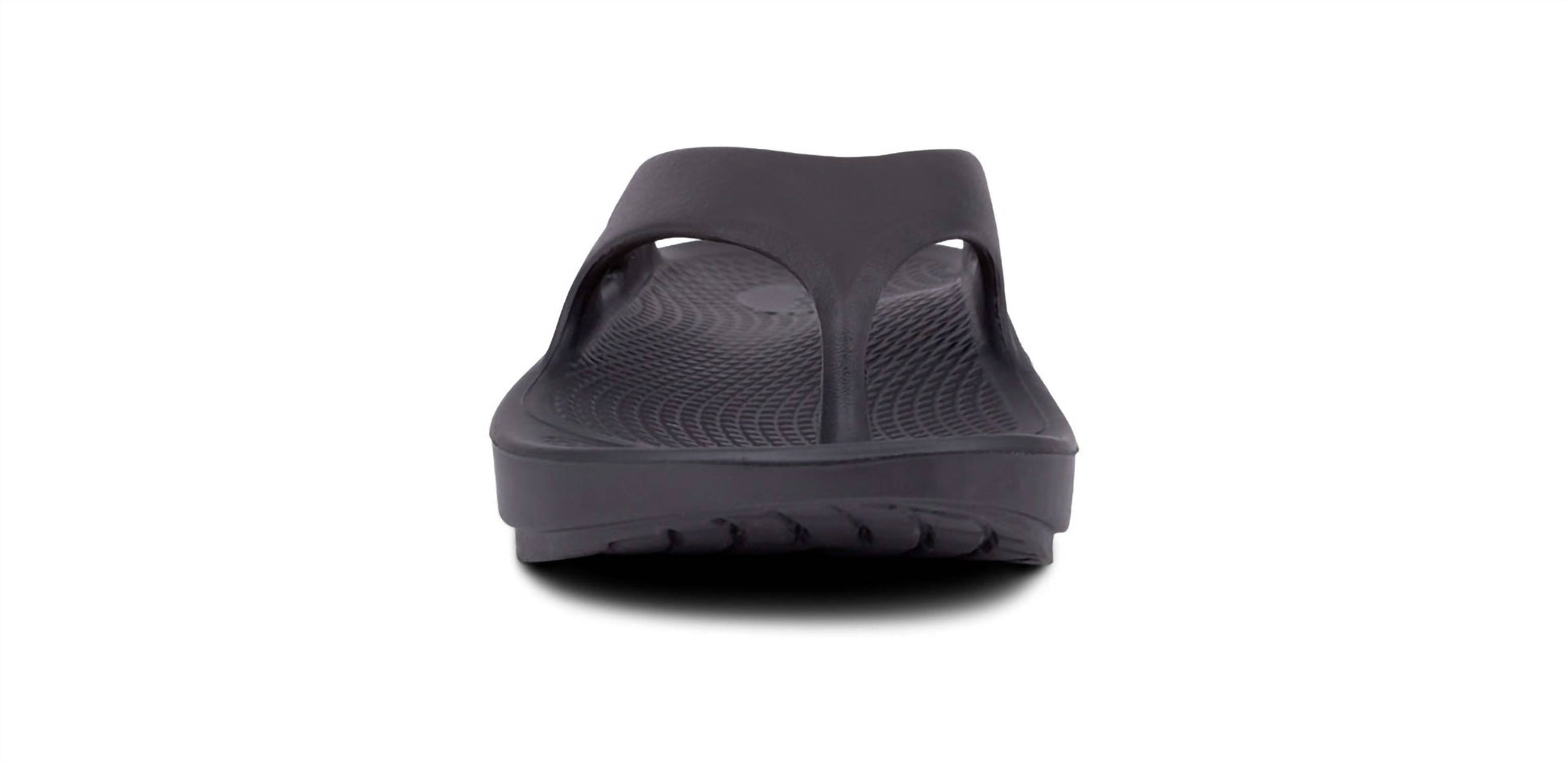 Experience the ultimate comfort with the Women's Ooriginal Thong Sandals by OOFOS, crafted in a sophisticated color. Designed specifically for women, these sandals boast a round toe and low flat heel, optimizing natural foot motion. With revolutionary OOfoam™ technology, they absorb 37% more impact than traditional foam, reducing stress on feet, knees, and back while aiding in recovery. These lightweight sandals are machine washable and moisture and bacteria-resistant, embodying minimalistic design for everyday wear.