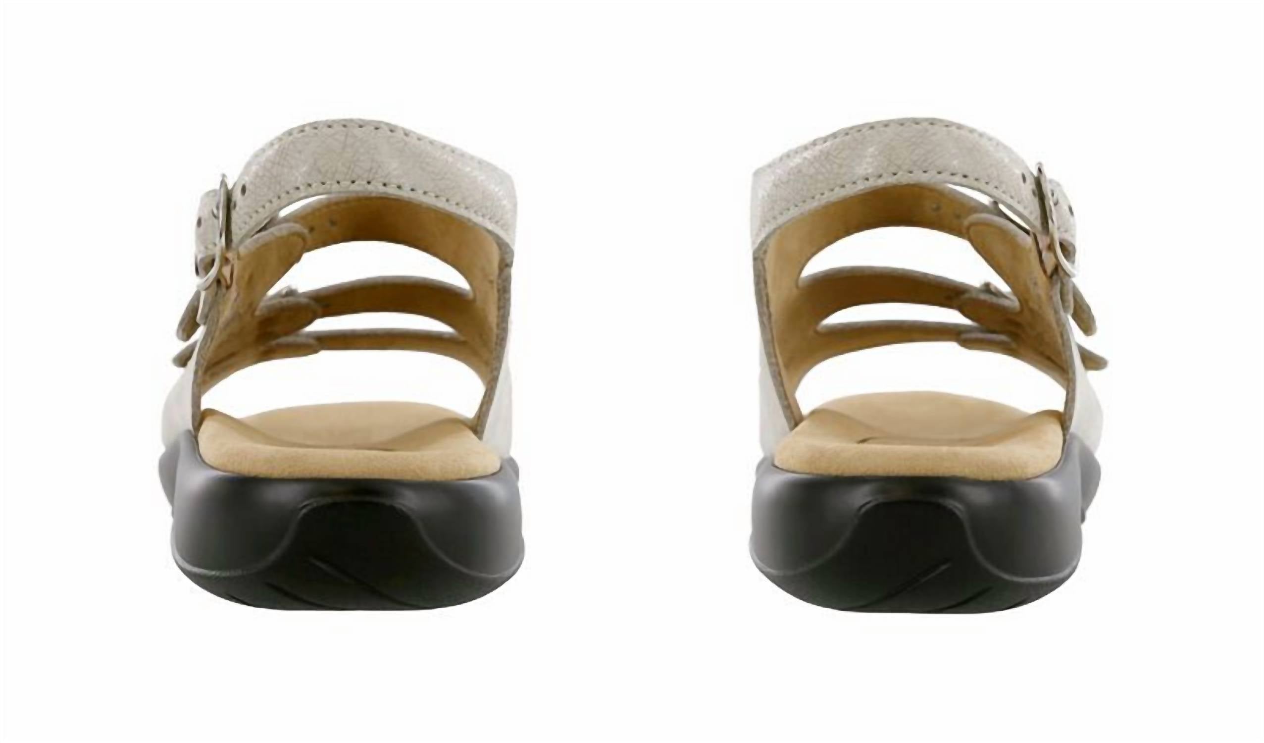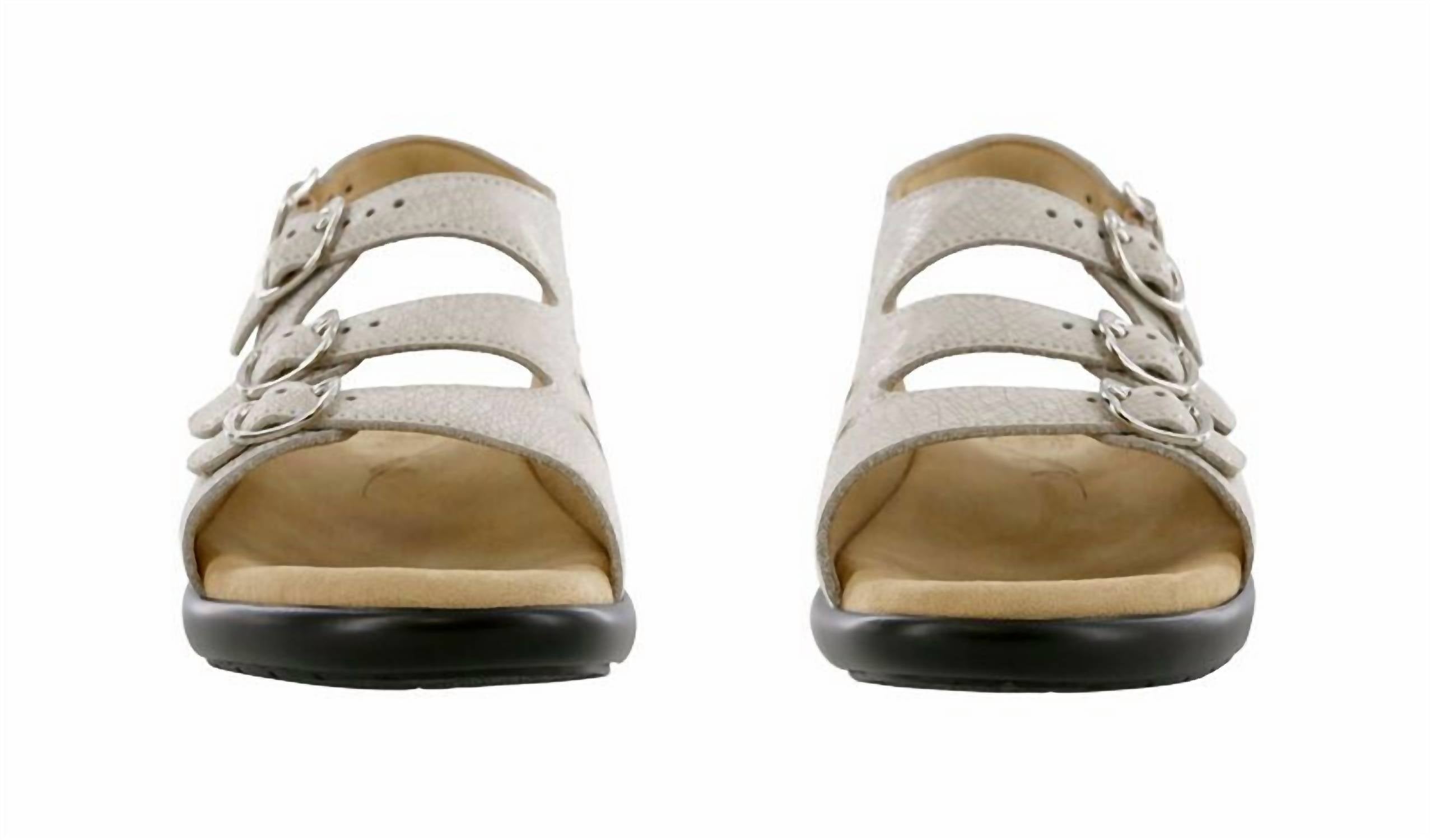 Flowy dresses, cropped pants, and even jumpsuits... this sandal works with them all! Introducing the Women's Mystic Sandal by SAS, a perfect blend of comfort and style in a chic linen hue. These sandals are crafted for personalized fit with four adjustable buckles, two of which are elasticized for flexibility with your steps. The genuine leather upper on this sandal is meticulously designed to follow the natural shape of the foot, complemented by a contoured insole for ultimate support. With a 1.375-inch heel and a shock-absorbing sole, it provides stability and comfort throughout the day.