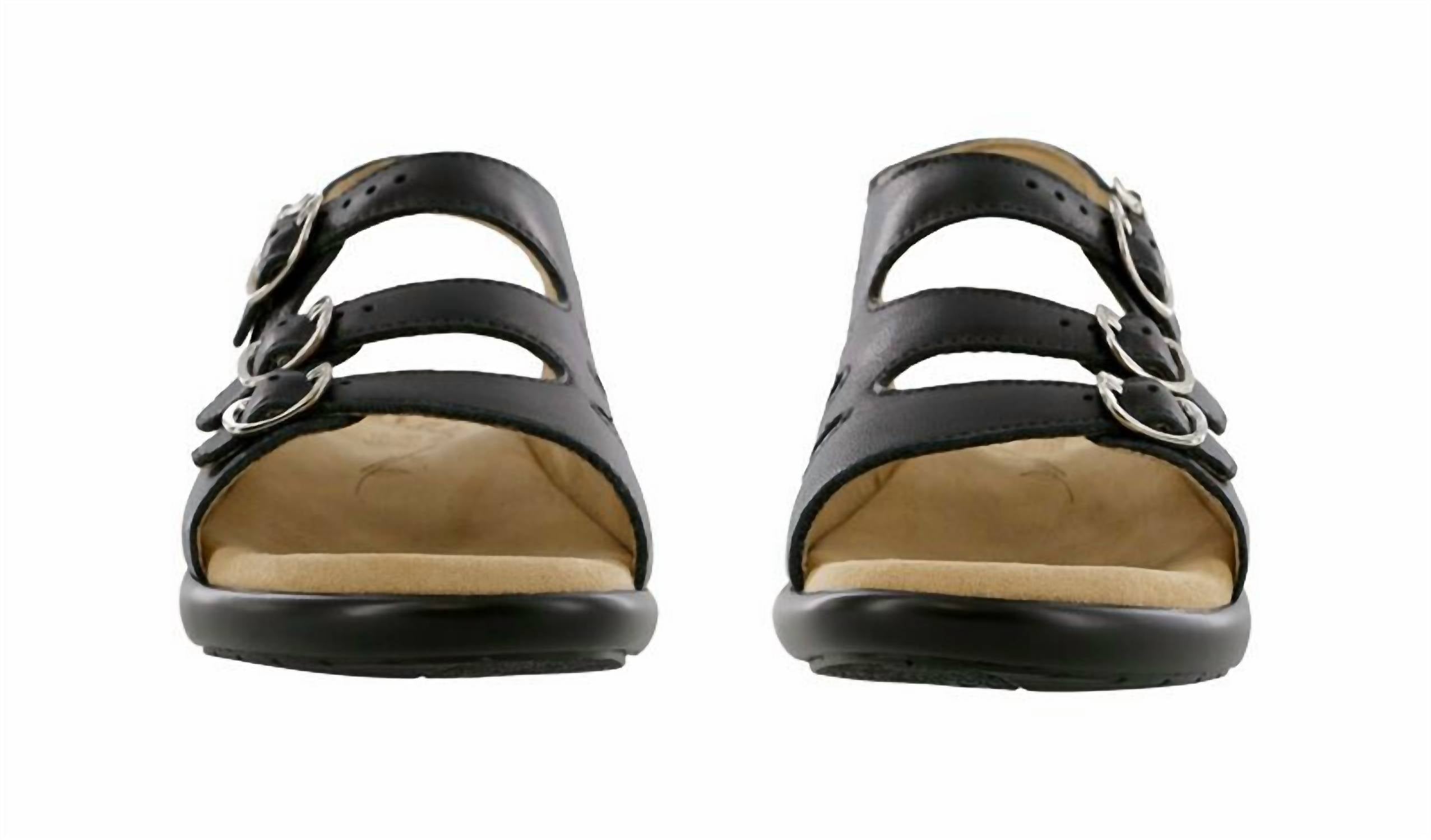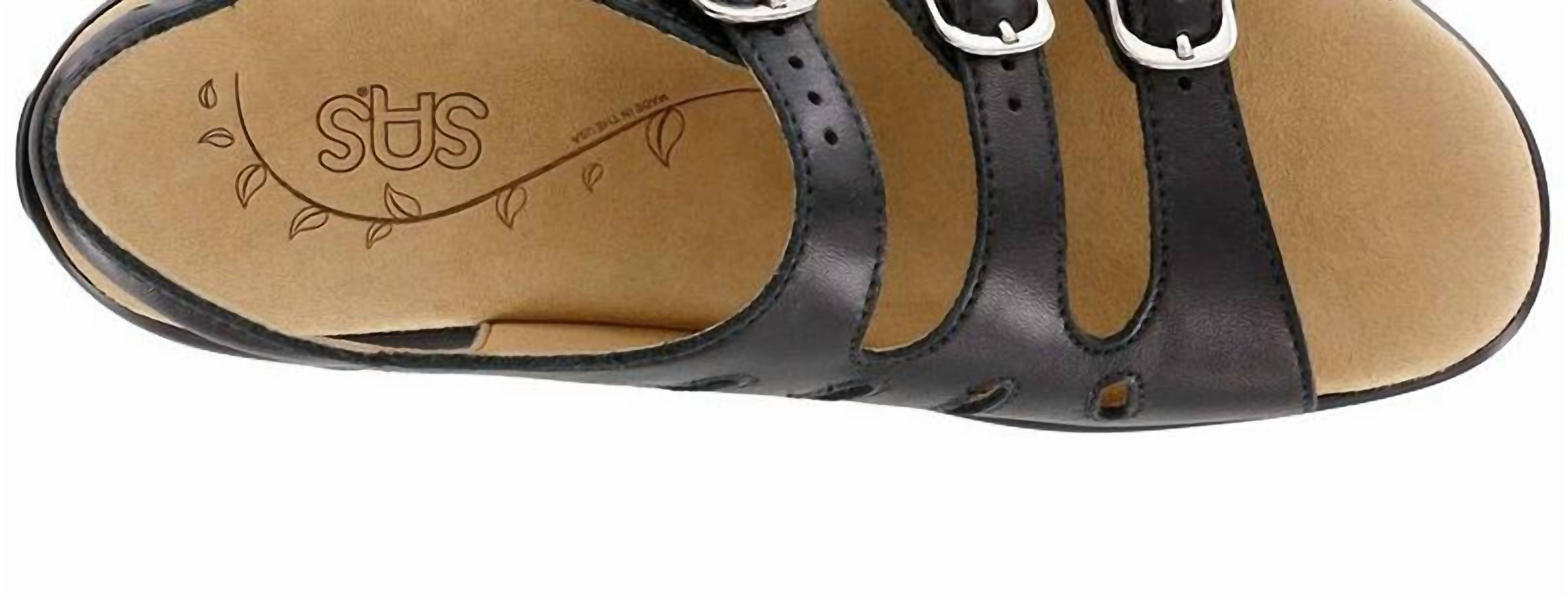 Classicly cute and all-day-wearable. We love this sandal. Experience the ultimate in customizable comfort with the Women's Mystic Sandal by SAS, crafted in sleek black for timeless style. This sandal boasts a genuine leather upper that follows the natural shape of your foot, offering four adjustable buckles for a personalized fit throughout the day. Enjoy a walk with its contoured insole covered with a full-length shock-absorbing cushion, providing ergonomic support to the natural arches and curves of your foot. Perfect for women, this open-toe sandal features a subtle 1.375-inch heel height, making it a versatile addition to any wardrobe.