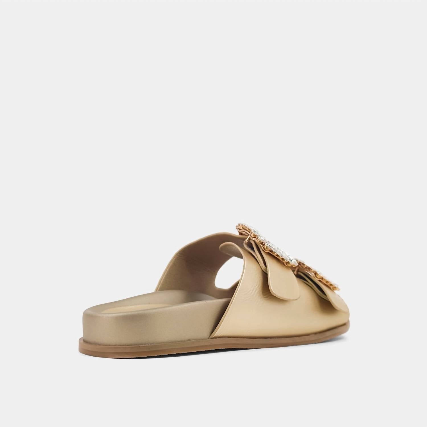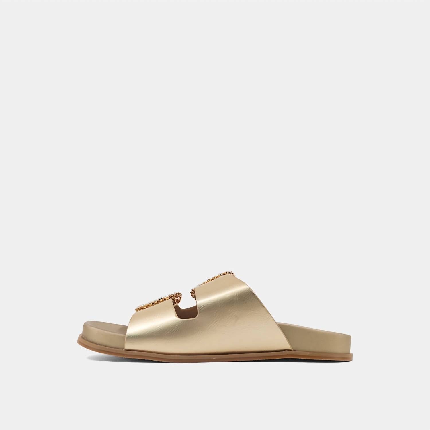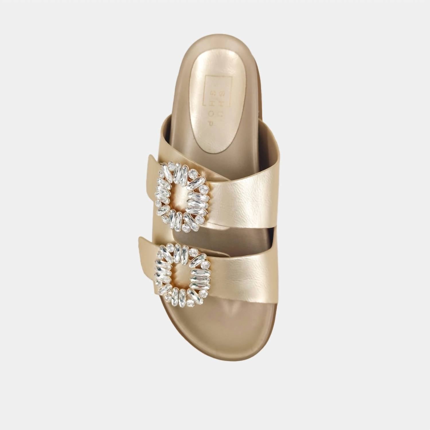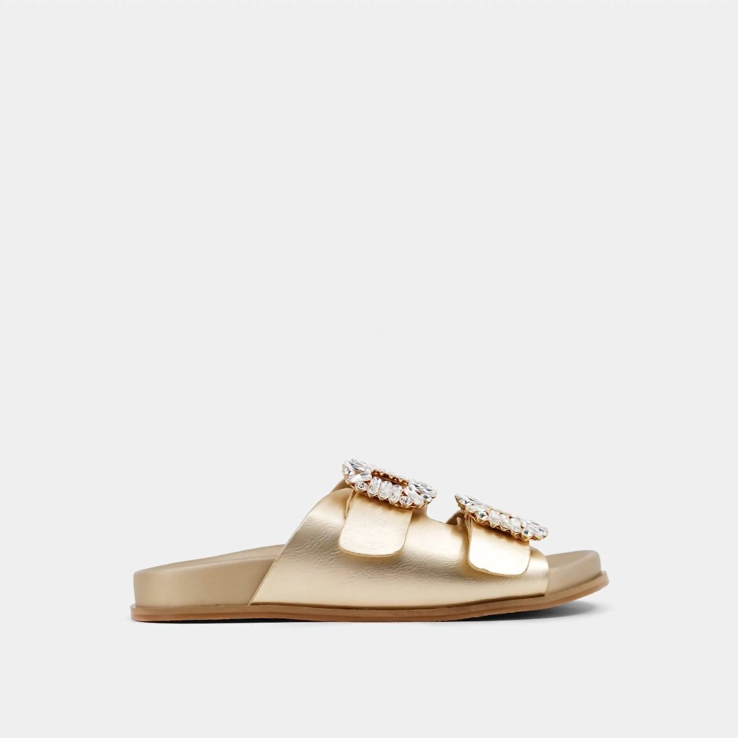 Crafted from super soft faux leather, these sandals feature a comfortable molded footbed, ensuring all-day wearability. Adorned with two crystal-embellished buckle ornaments, they add a touch of sparkle to any outfit. Designed with an open toe shape for breezy style.