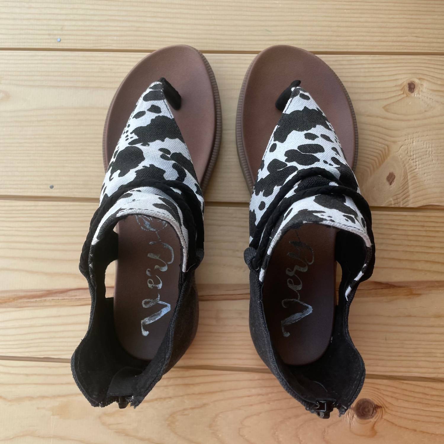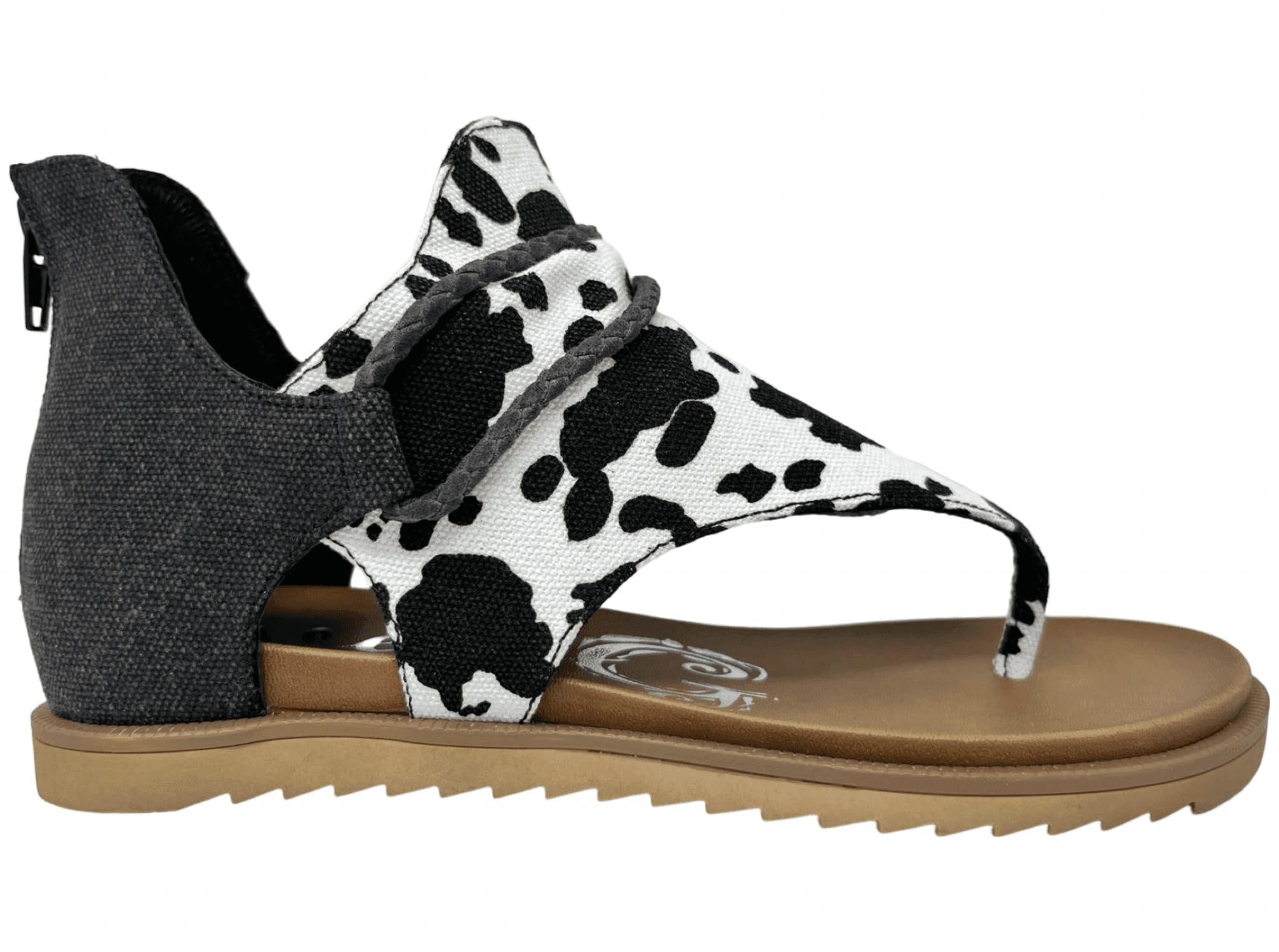 Classicly cute and all-day-wearable. We love this sandal. Step into style and comfort with the Women's "Angelika 2" Cow Sandal by Very G. Designed in a striking black and white cow print, these sandals are an ideal choice for a vacation or your everyday summer adventures. Featuring an open toe and flat heel, they incorporate a cushioned sole and a chic buckle detail for extra flair. Perfectly maximalist, these slip-ons fit true to size, offering both comfort and style for adults.