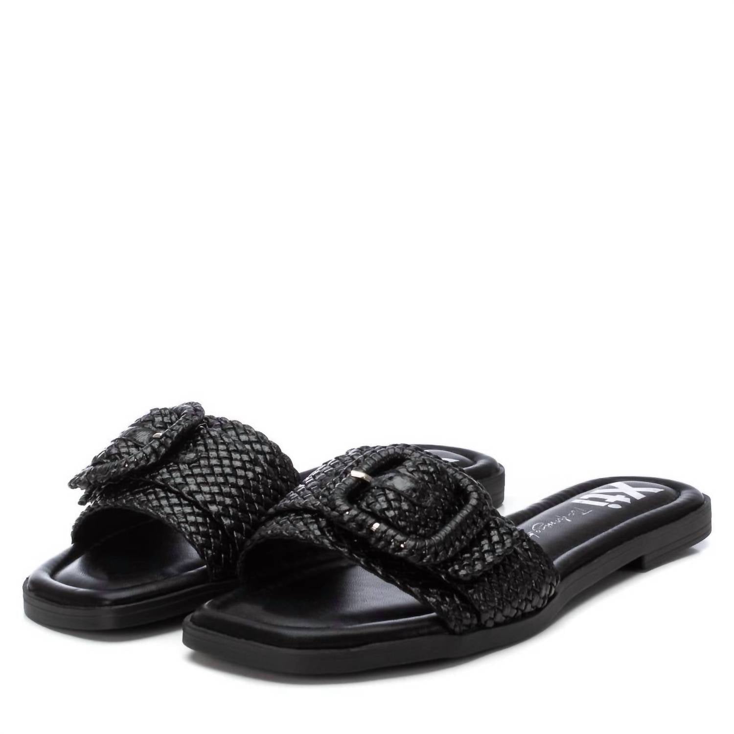 Flowy dresses, cropped pants, and even jumpsuits... this sandal works with them all! Elevate your wardrobe with the Women's Casual Flat Sandals by Xti, designed to offer both style and comfort. These sandals feature a chic metallic effect textile material in a classic hue, complemented by a decorative buckle on the shovel design. With a squared toe shape and a super comfortable flat, non-slip sole, these sandals ensure a secure fit without any fasteners, perfect for casual outings. Proudly vegan-certified by PETA, they are crafted from synthetic outer fabric with a focus on sustainability and ethical fashion.