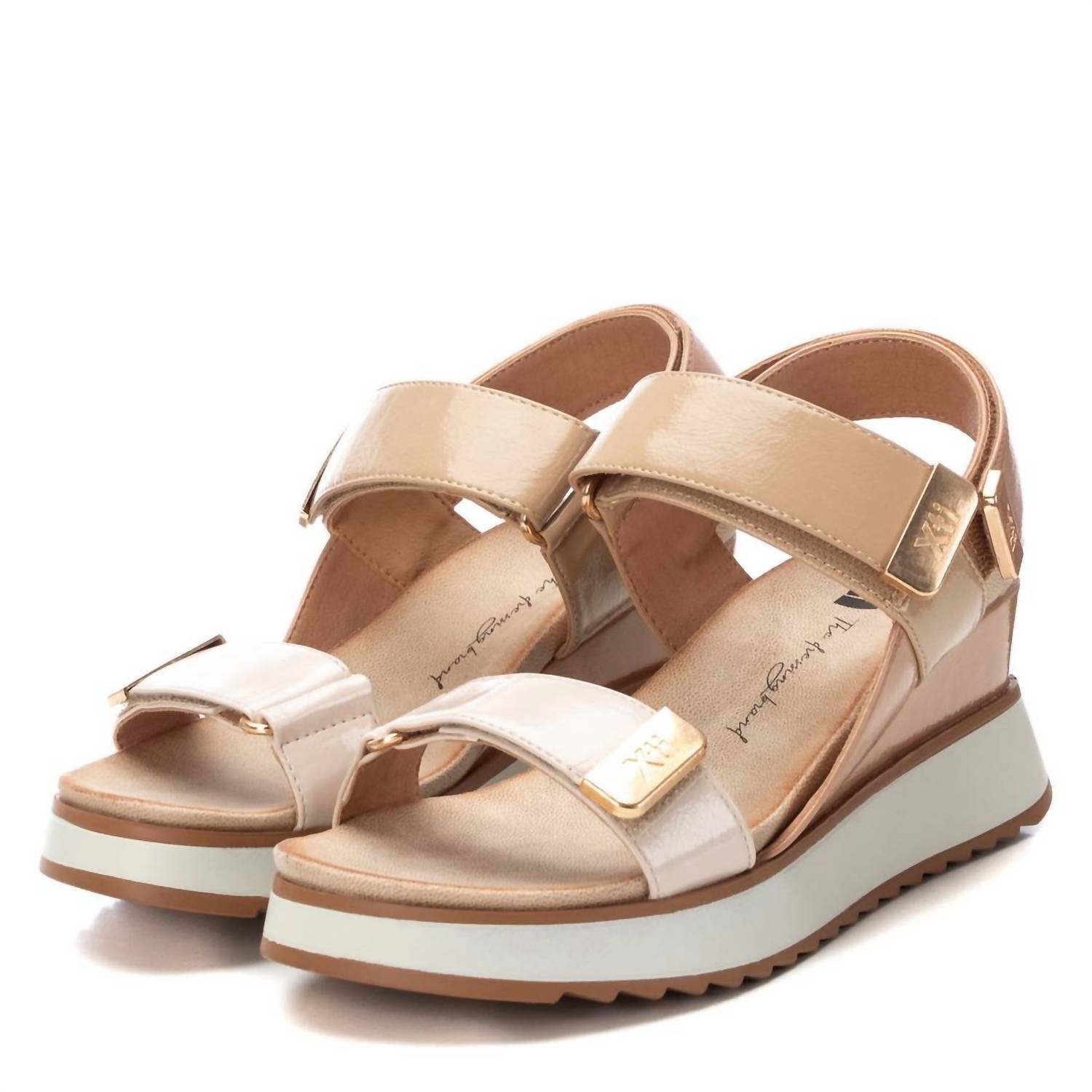 Flowy dresses, cropped pants, and even jumpsuits... this sandal works with them all! Step into style and comfort with Xti's Women's Wedge Sandals, presented in a chic hue. These sandals feature a fashionable wedge heel that measures mid-height, providing a perfect lift without compromising comfort. With a versatile round toe design, these sandals seamlessly adapt to both casual and elegant outfits. Made for durability and style, they are the go-to choice for any outing.