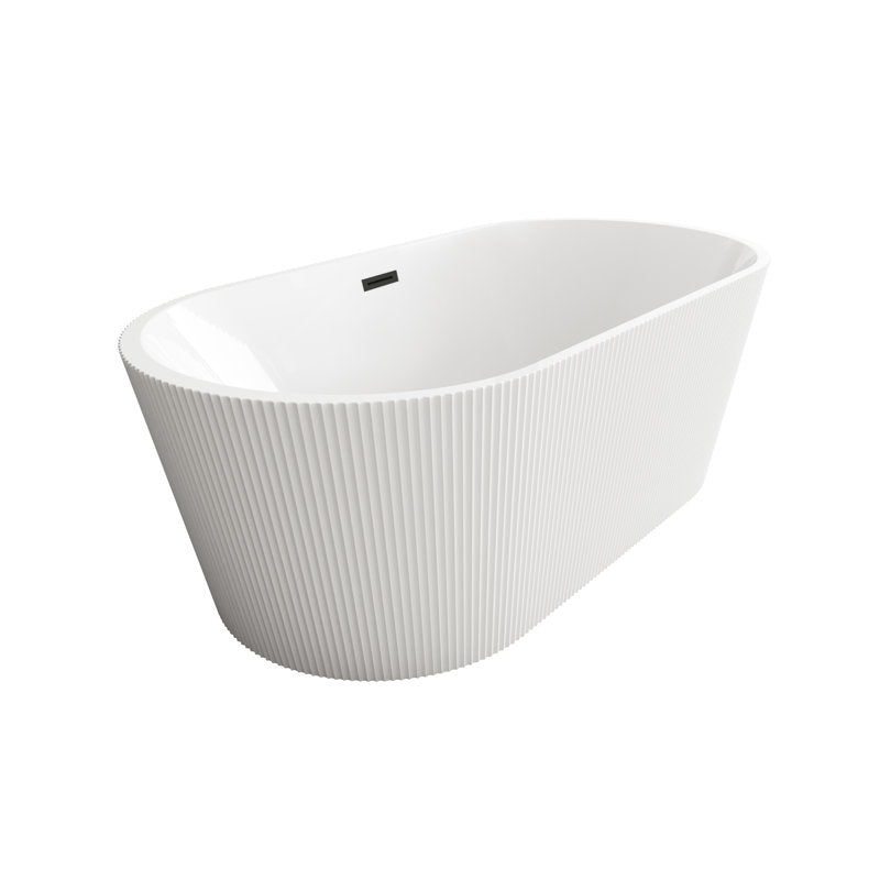 Immerse yourself in the ultimate relaxation experience with this elegant freestanding soaking bathtub featuring a beautifully textured vertical fluted design that adds a touch of sophistication to your bathroom The smooth rounded rim offers comfortable arm support making it the ideal spot to unwind Equipped with a popup drain and integrated overflow this tub seamlessly combines convenience and style With a generous capacity and 15inch soaking depth its perfect for those looking to ind