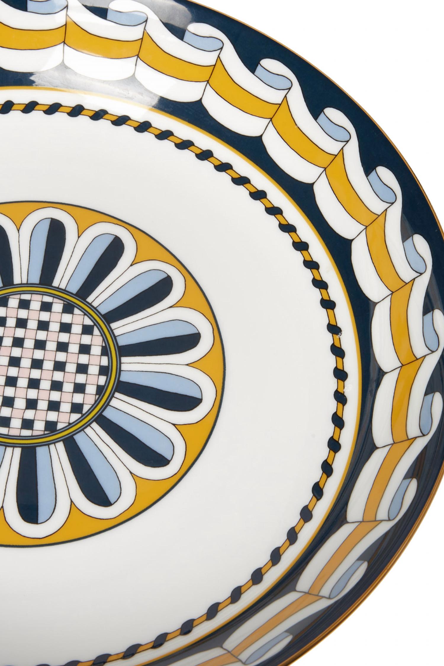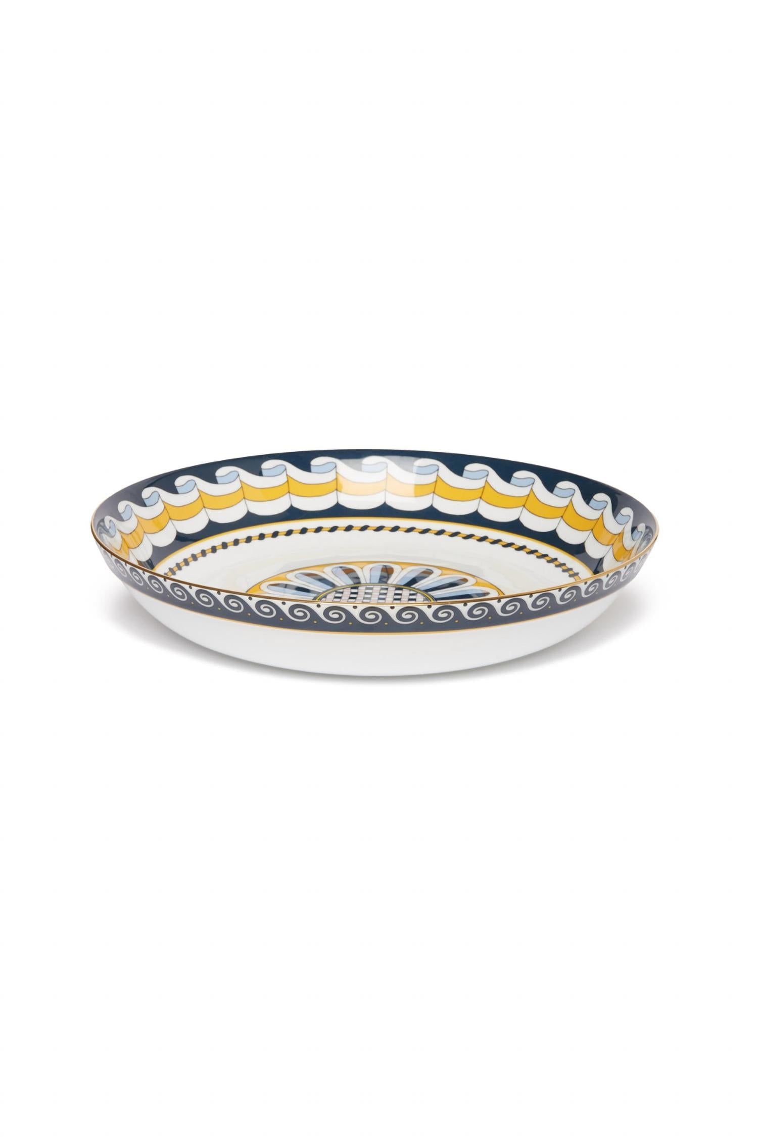 This Pasta Bowl is crafted from Italian-made 100% Porcelain with an 18K gold rim and a wide, shallow design. Dishwasher safe for easy care.