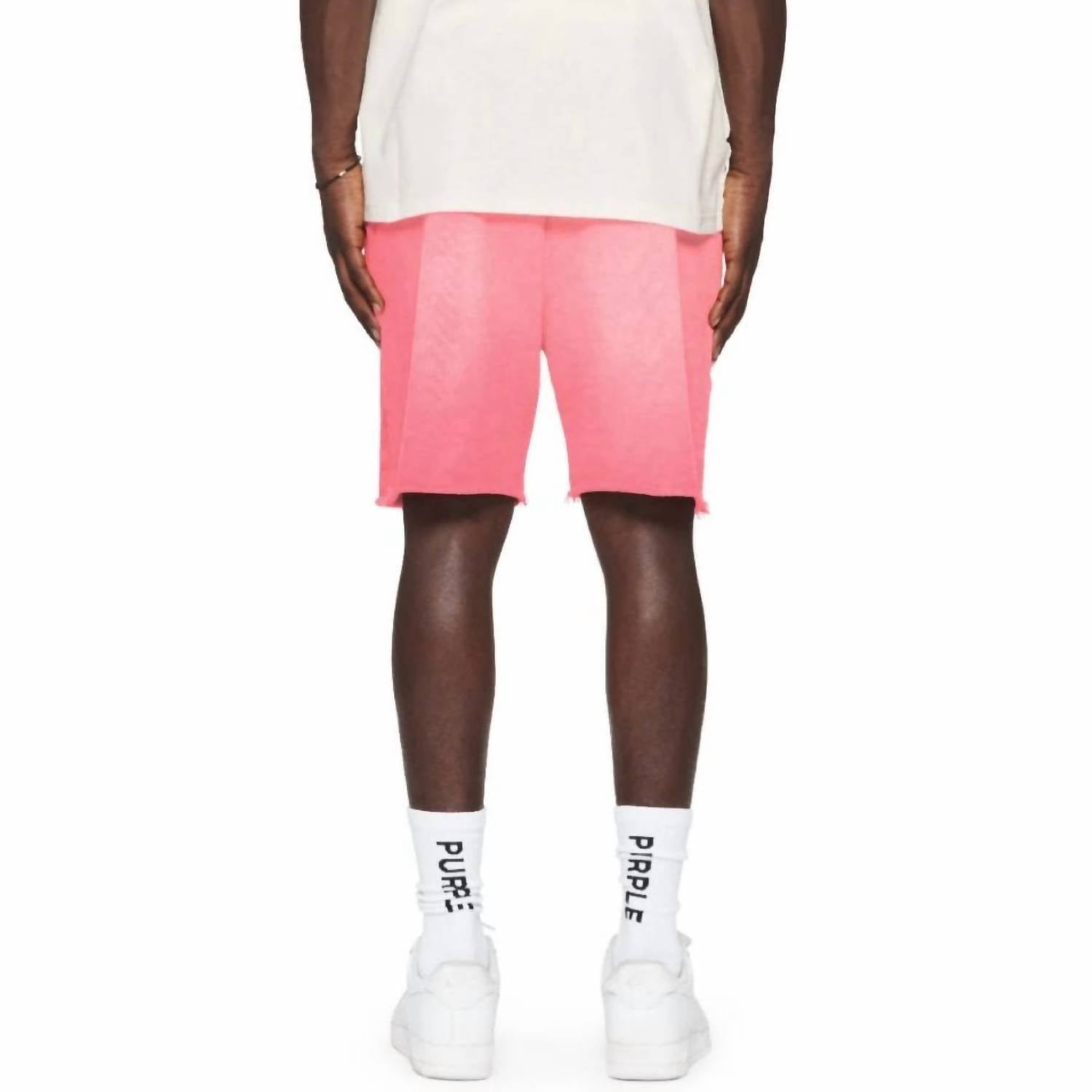 Introducing the Wordmark Terry Sweatshort by Purple Brand, a stylish choice in desert pink perfect for your summer workout wardrobe. Designed for men, these athletic shorts feature a relaxed fit with an elastic waistband and tie closure against a midweight, 100% cotton French terry fabric. With a 14.5" front rise, 6.375" inseam, and 11.75" leg opening, you'll appreciate the comfort of slit pockets and the streetwear trend vibes. Embodying a solid faded wash with white label flock print and raw hem, these shorts exude casual appeal. Care instructions: Machine wash.