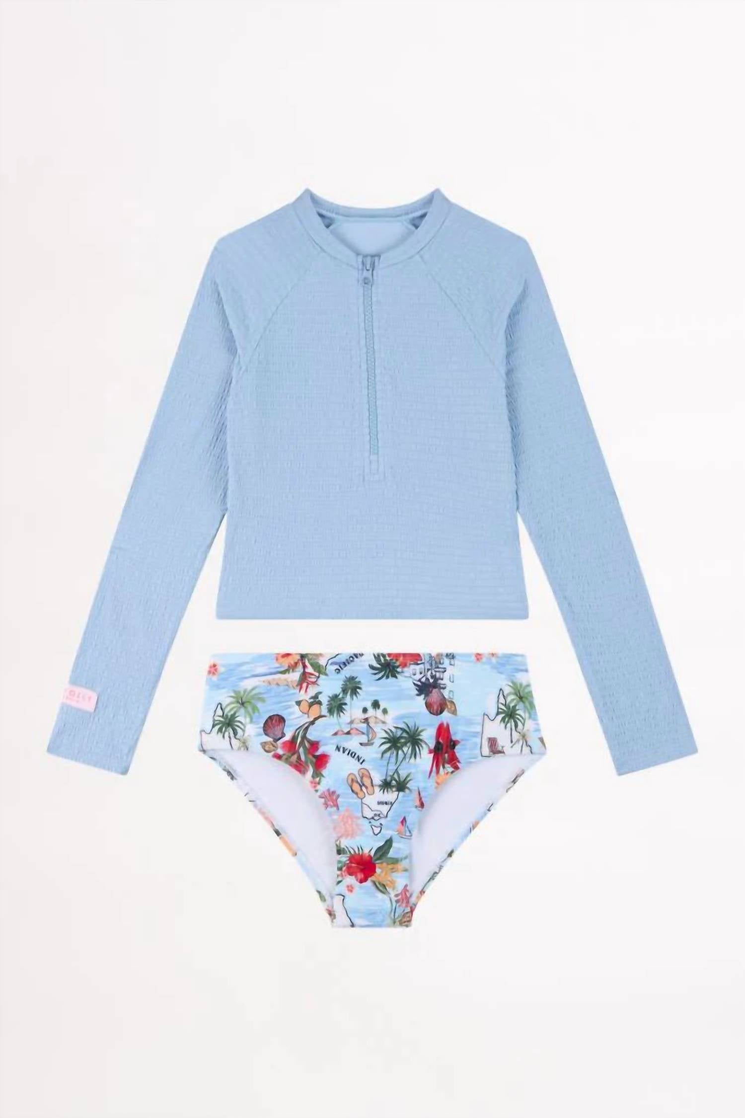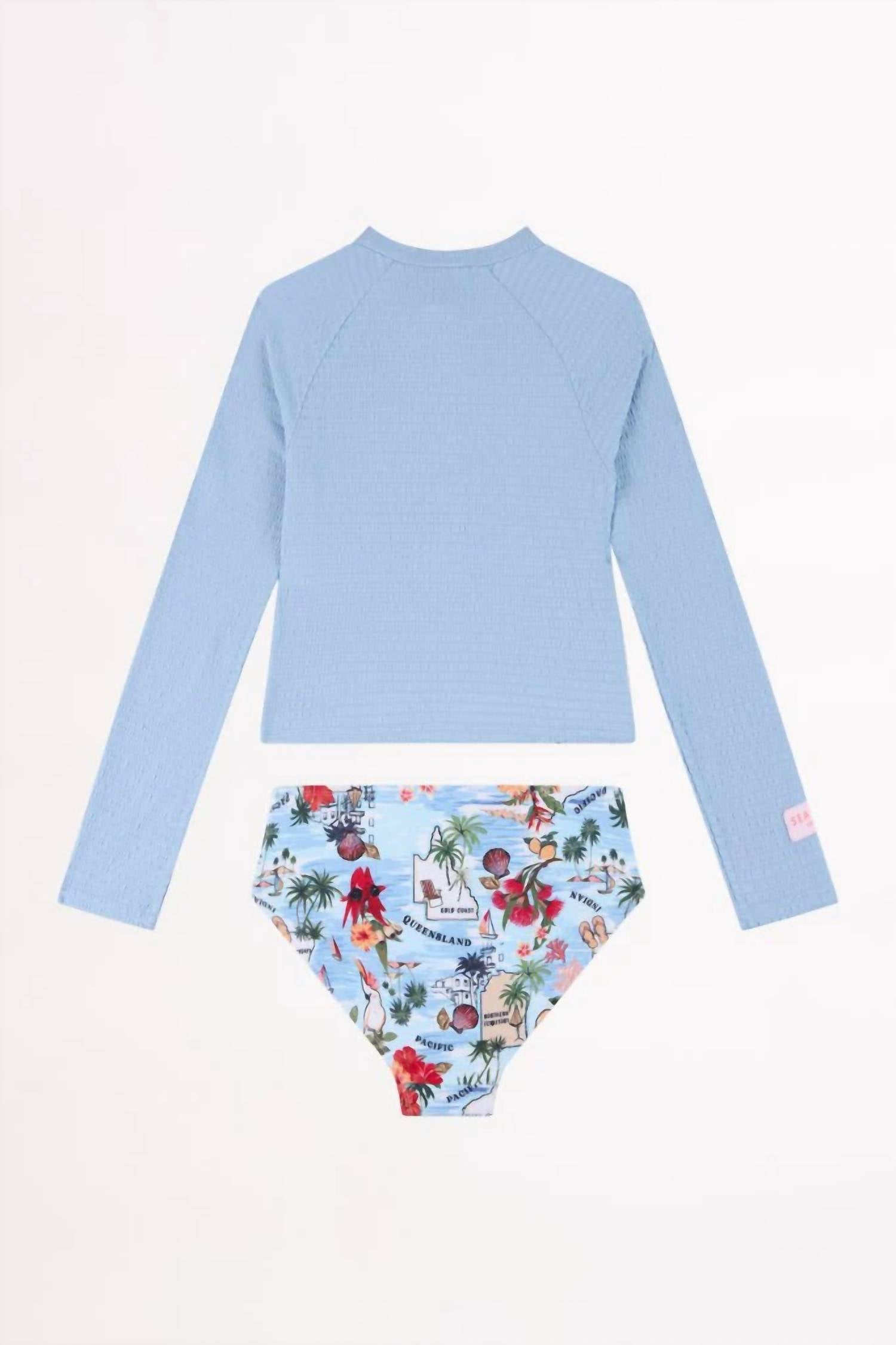 Dive into summer fun with the Seafolly Girl's Summer Vacay Surf Set in a vibrant blue that captures the essence of sun-soaked days. This set features long raglan sleeves and a semi-cropped rashie for a comfortable fit, paired with a semi high-waisted brief. Designed with a convenient zip front closure, perfect for a secure fit. Made to withstand the elements while keeping style intact.