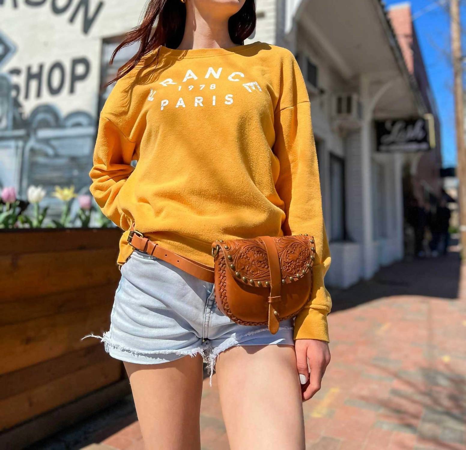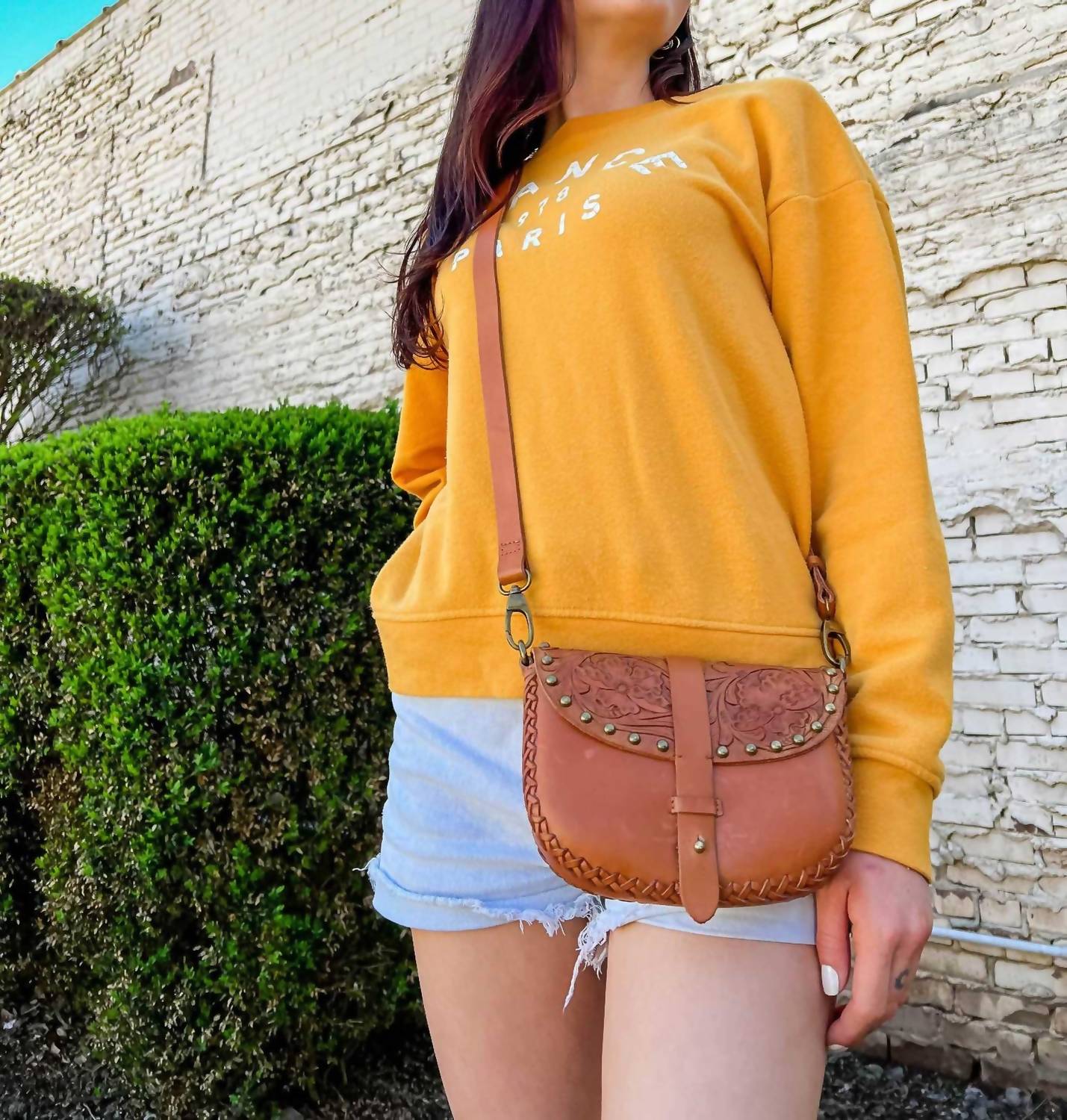 A casual and cute take on everyone's favorite crossbody bag. The Women's Cassie Convertible Leather Crossbody Bag by Anabaglish is crafted from high-quality tooled leather in a warm brown hue. Stylish antique brass hardware and rivet details accentuate its design, while dual leather straps provide versatile styling options—transitioning from a belt bag to a crossbody or shoulder bag with ease. Its practical features include a cotton lining, one interior pocket, and dimensions of 8" width, 1.18" depth, and 6" height. The belt measures 41.25" in length with a strap drop of 21.5", perfect for the modern city explorer.