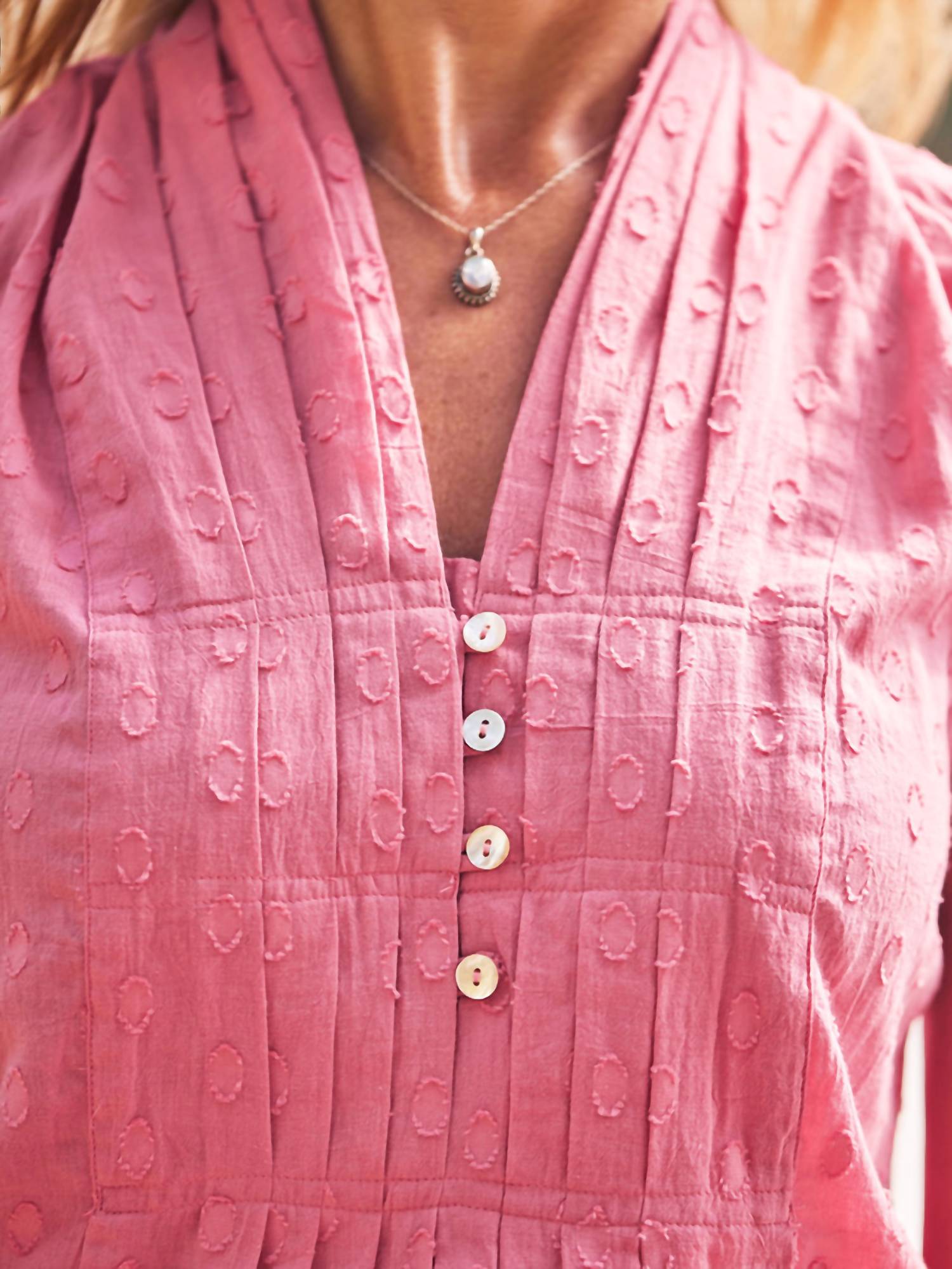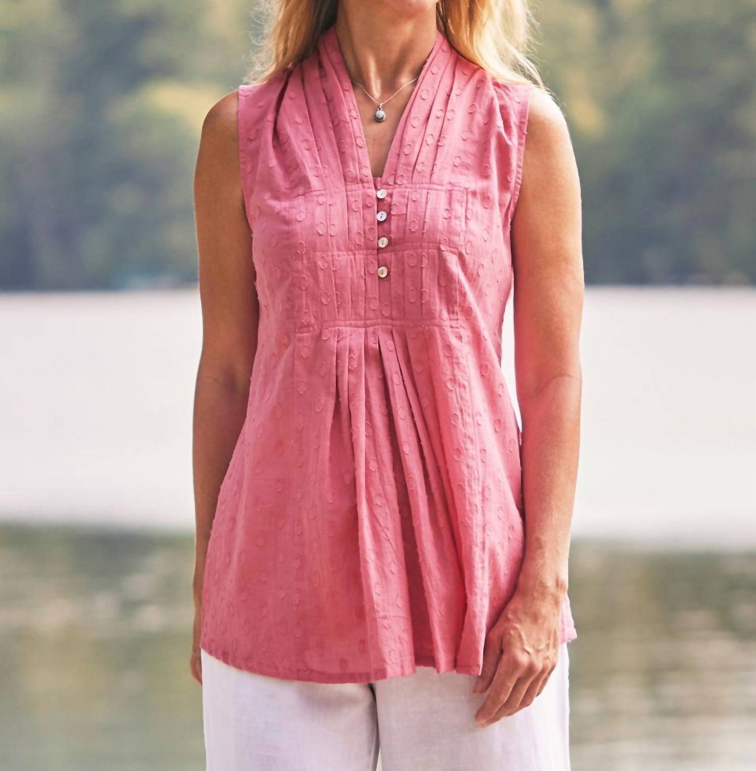 Introducing the Cameo Sleeveless Blouse by April Cornell, a Swiss dot cotton masterpiece in a captivating coral hue. This textured blouse features a pleated neckline and bodice details, adorned with elegant mother of pearl buttons, and a gently curved hem for added flair. Crafted from 100% cotton, this garment ensures comfort and style, with a button closure adding sophistication. Care instructions are simple: machine wash in cold water on a gentle cycle and line dry. Helen, standing 5'9", is showcasing a size small that measures 30" in length.
