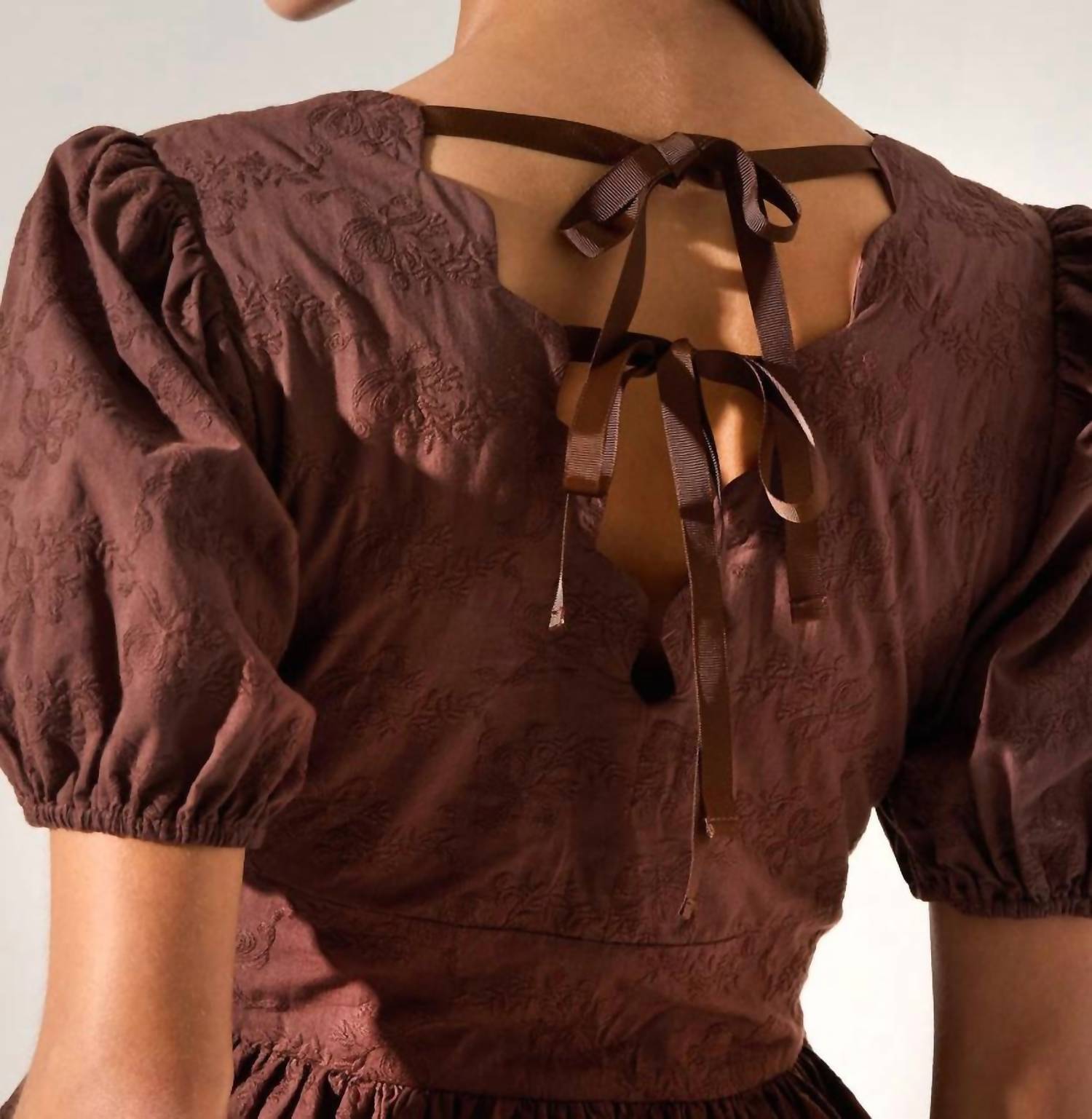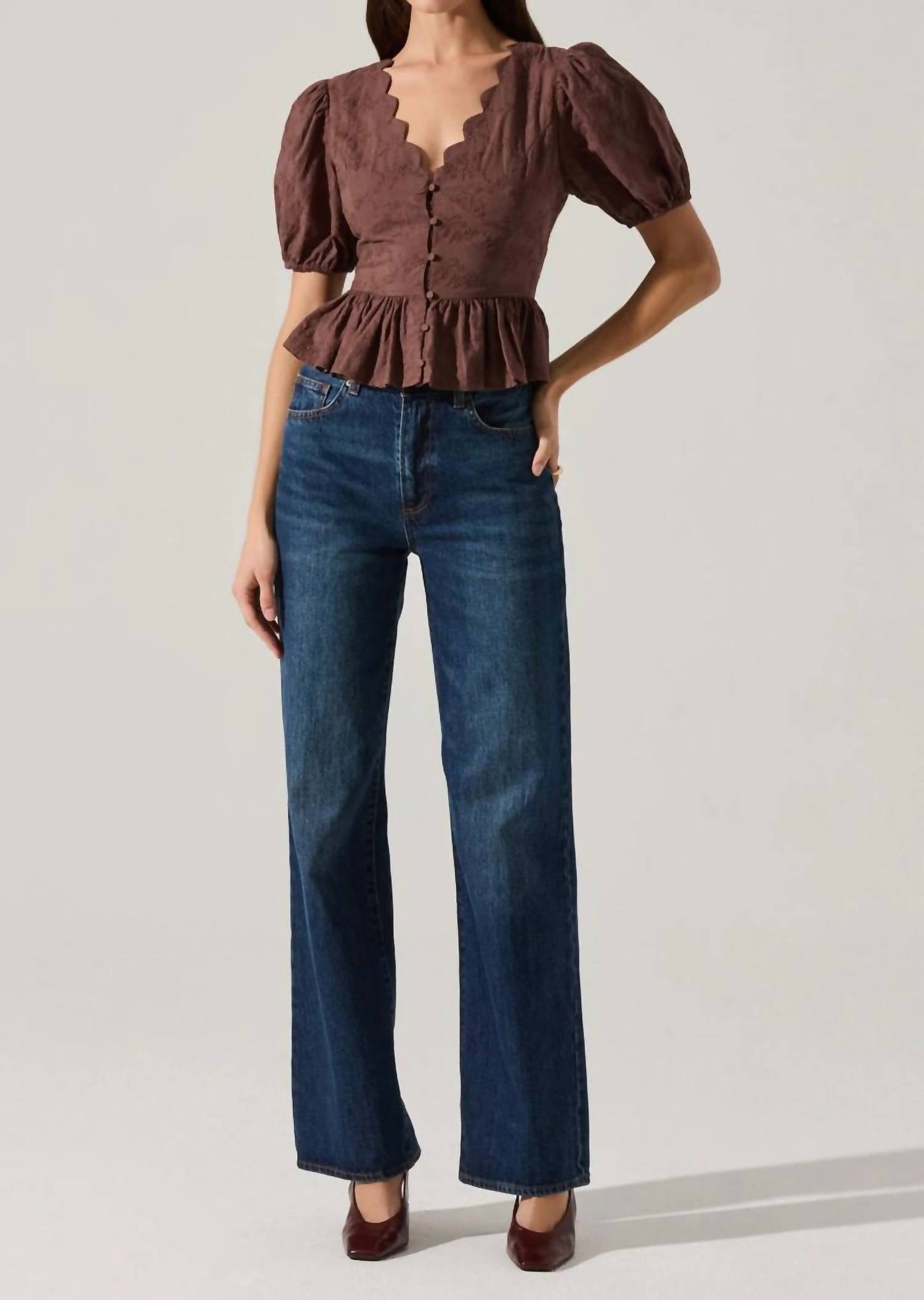 Elevate your wardrobe with the Arely Scalloped V-neck Peplum Top by ASTR, a feminine staple in a warm brown hue. This blouse is crafted from 100% cotton and features a delicate V-neckline with scalloped edges, complemented by short puff sleeves. Its structured bodice offers a textured design, perfect for a holiday party or spring outings. Closure: Tie closure. Care: Dry clean only.