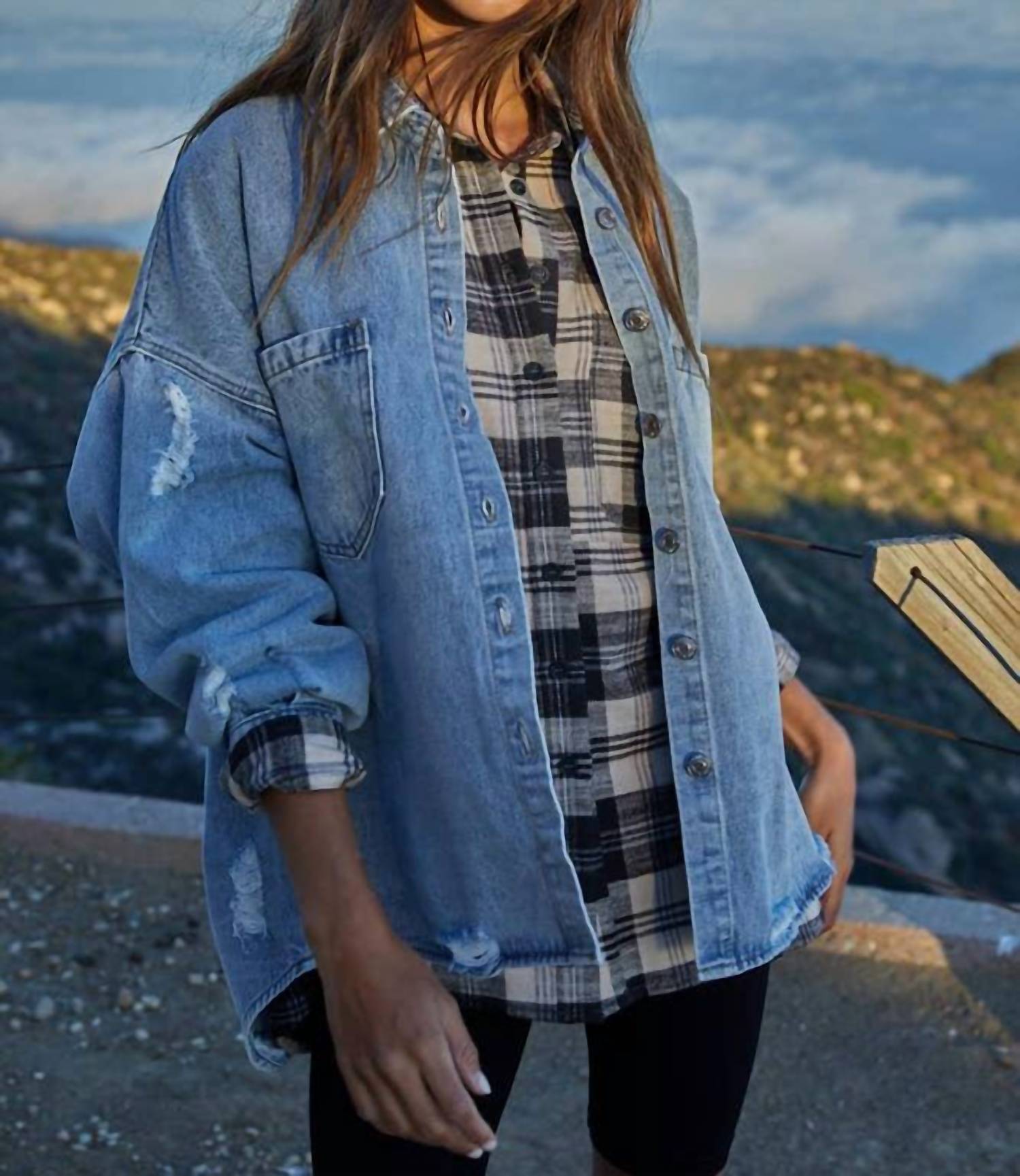 Classic, cool and works with almost any outfit choice. Embrace the 90s fashion trend with the Luca Washed Denim Shacket by By Together, a quintessential addition for any wardrobe. This blue jean jacket showcases an oversized fit reminiscent of a boyfriend shirt, featuring long sleeves and a stylish collar. Made from solid washed denim, it is a versatile piece complete with functional front buttons and handy pockets. Closure: Button Closure. Care: Machine wash, line dry, perfect for back-to-school style.