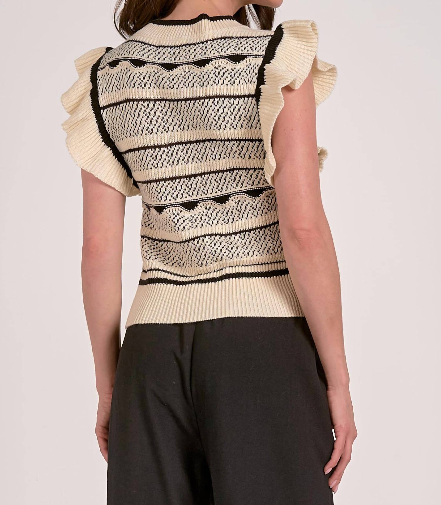 Experience the perfect blend of comfort and style with this trendy crew neck sweater, designed to effortlessly elevate your wardrobe. Pair it with your favorite denim and loafers for the perfect look. Elevate your wardrobe with the ELAN Zaza Sweater, a charming and stylish cap-sleeve tank top perfect for any occasion. Crafted from a textured cotton blend, this off white and black piece features a crewneck design that effortlessly blends comfort with playful sophistication. Closure: Pull on.