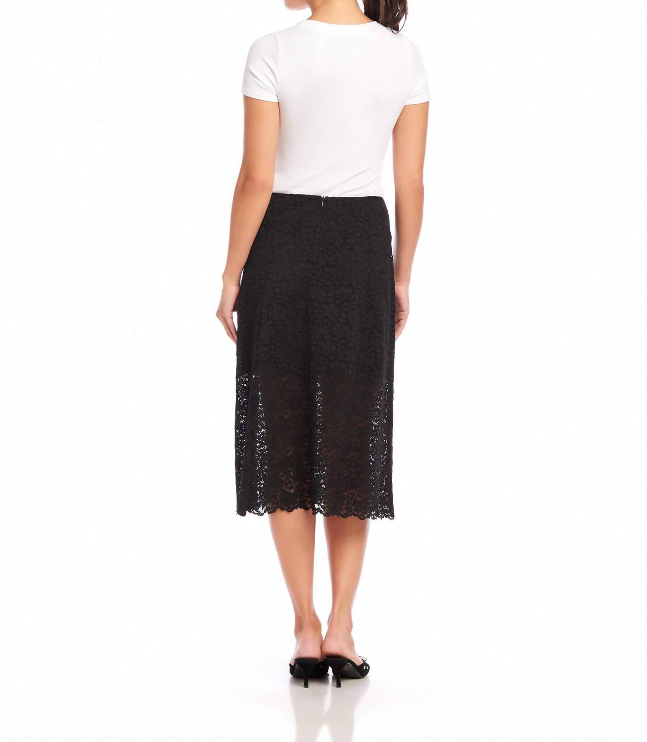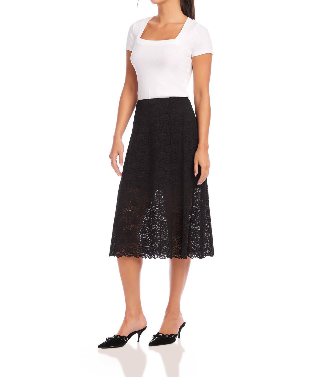 Tuck your favorite tee into this midi length skirt for an effortlessly cool look. Elevate your wardrobe with the Millie A-line Midi Skirt by Fifteen Twenty, where comfort meets elegance in fashionable black. This skirt features a 29-inch length with a classy scalloped edge crafted from a stretch lace blend of 88% Nylon and 12% Elastane. Originating from the USA, it includes a practical zip closure, making it easy to style for any occasion, from workdays to special evenings. For longevity, hand wash cold and lay flat to dry, or opt for dry cleaning.