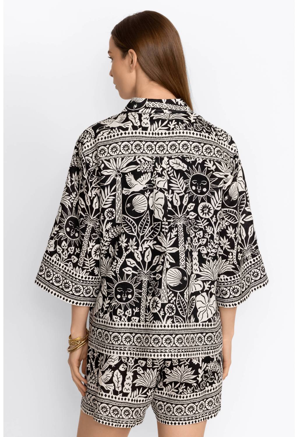 Pair this with your favorite jeans and slides for your next girls night out. Discover the Lucianna Kimono Sleeve Shirt by Johnny Was, a statement piece crafted from 100% linen for ultimate breathability. This relaxed-fit blouse, in elegant black and white, features three-quarter kimono sleeves and a traditional collared button front. The intricate patterned design adds a boho chic flair, perfect for a vacation ensemble. Care for this stunning piece by machine washing cold and tumble drying on low; measurements for size medium include a front length of 26" and a bust of 45 1/2".