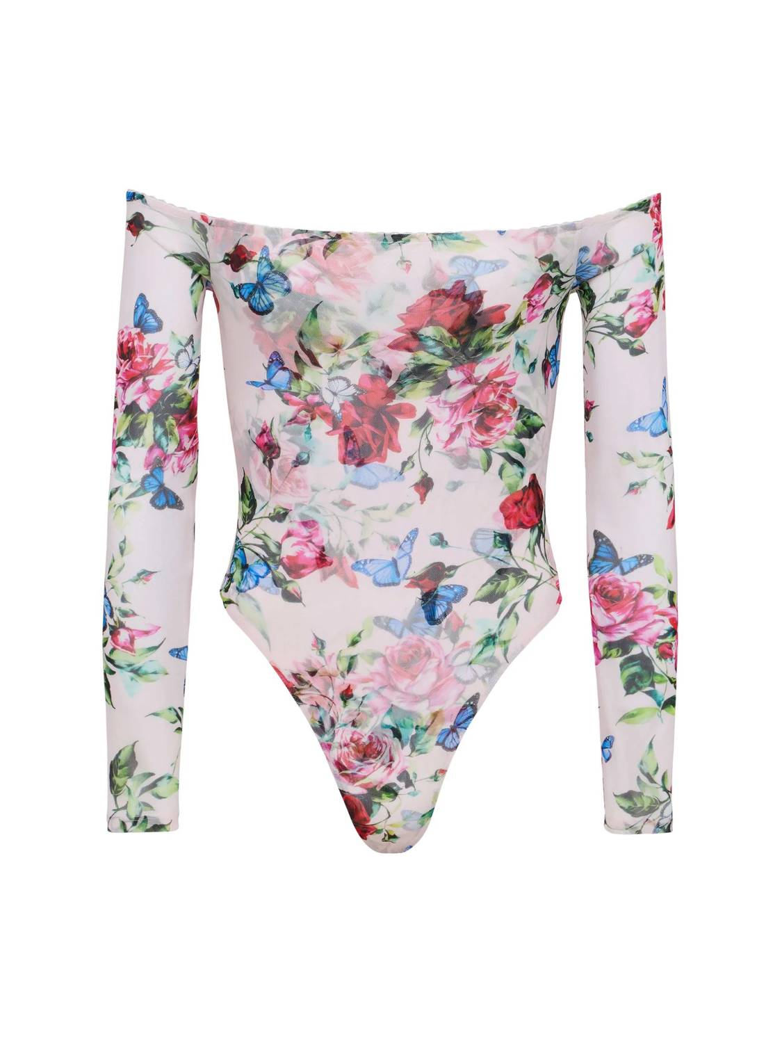Elevate your concert outfit with the Peonie Off-the-shoulder Bodysuit by L'Agence, a stunning choice in a light pink multi femme rose floral pattern. This women's bodysuit is crafted from a luxurious nylon blend, consisting of 90% nylon and 10% spandex, ensuring both comfort and flexibility. Designed with an off-the-shoulder neckline and long sleeves, it offers a chic and modern silhouette.