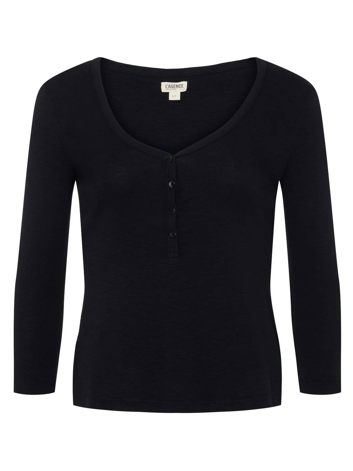 The perfect long sleeve tee that goes with just about anything. Introducing the Rowena 3/4 Sleeve Henley Top by L'Agence, a chic addition to any wardrobe. Crafted from 100% cotton, this black top features a stylish Henley style with a V-neck and three-quarter sleeves, making it perfect for versatile styling. Made in the USA with a convenient button closure, this garment measures 20.5 inches in length. Care for it by hand washing to maintain its pristine condition.
