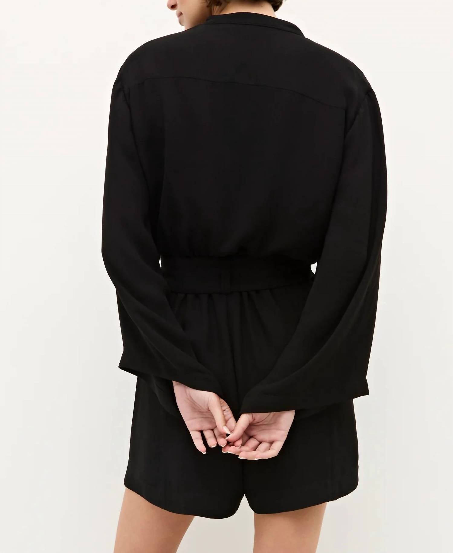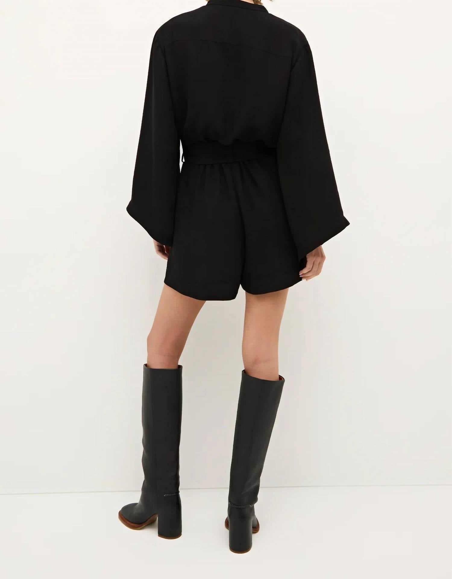 Throw it on and go! The Trina Romper by Marie Oliver in classic black is the epitome of quiet luxury for your holiday party ensemble. Featuring flared sleeves and a drop shoulder design, it offers a relaxed fit through the bust and hips, accentuated by a fitted waist with an elastic back. Crafted from 100% polyester, this high-rise romper includes a hidden zip closure and an optional D-ring belt for added style. Care instructions: Hand wash with gentle detergent and line dry or opt for dry cleaning.