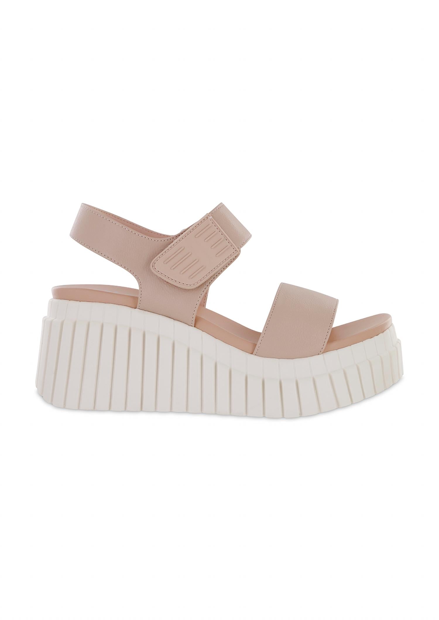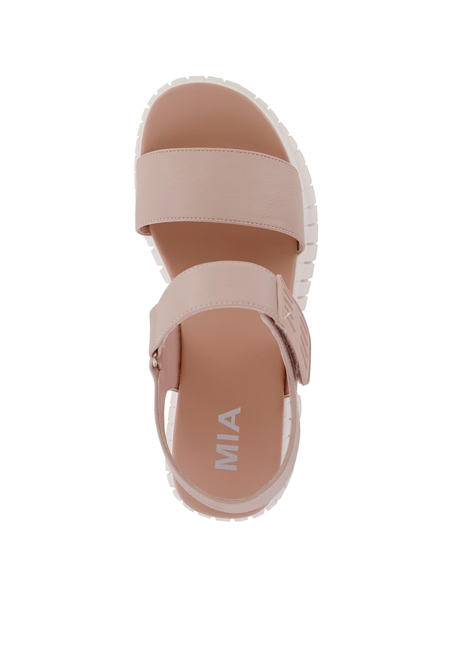 Classicly cute and all-day-wearable. We love this sandal. Step into the season with the Women's Yuri Sandal by MIA, crafted in a blush hue for modern flair. This sandal is made from soft, vegan leather featuring an open toe design and a single strap with a velcro hook-and-loop ankle closure. It stands out with its signature contoured footbed and a subtle 2.8-inch wedge boasting a unique diagonal line pattern. A perfect minimalist addition for your summer wardrobe, ideal for vacation and Mother's Day occasions.