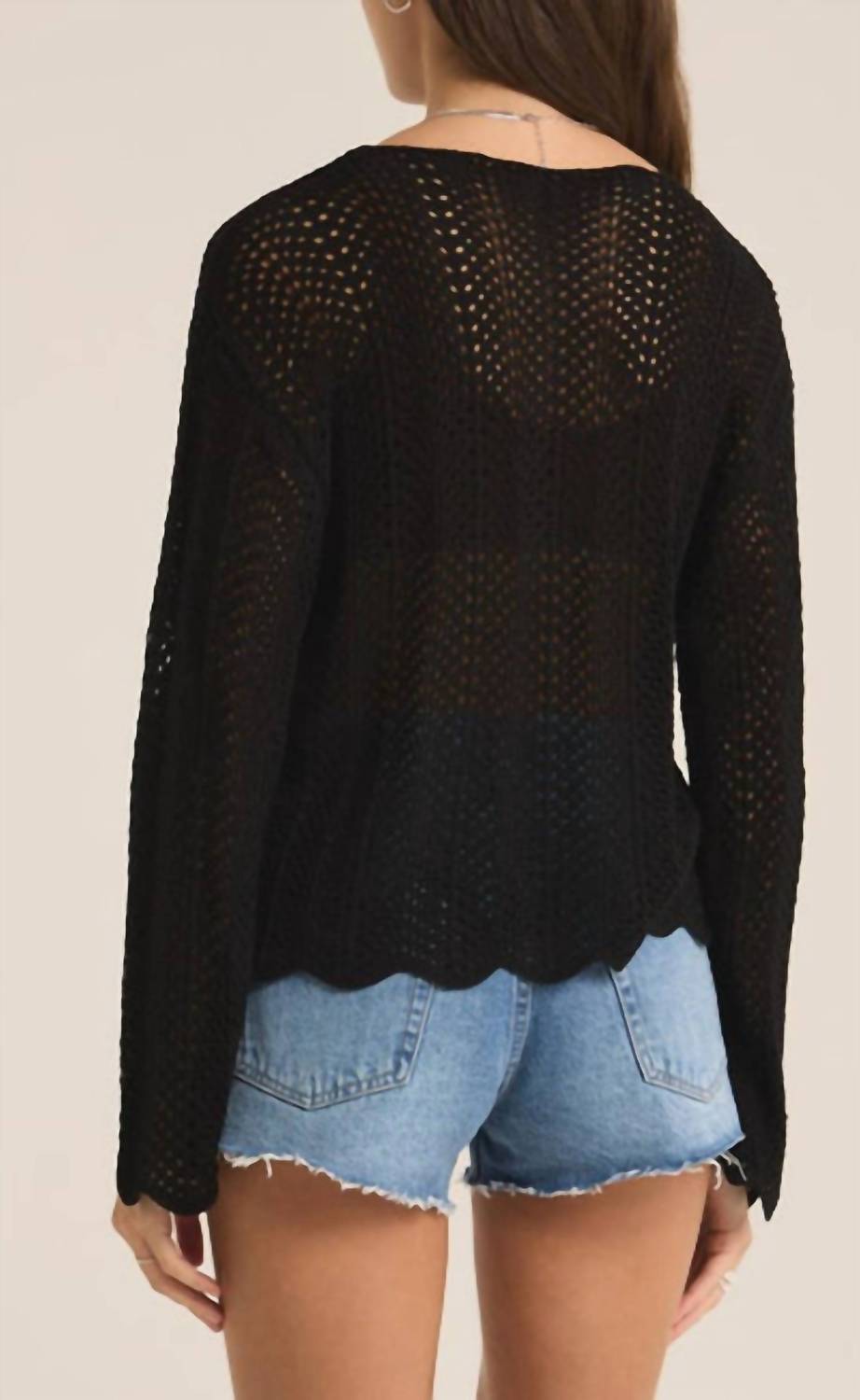 A long sleeve top you can wear with denim, skirts, well... just about anything! Vintage pointelle crochet. Dropped shoulder. Scalloped edge. Bra friendly. Relaxed Fit. 100% Viscose. Hand Wash Cold, Lay Flat to Dry, or Dry Clean.